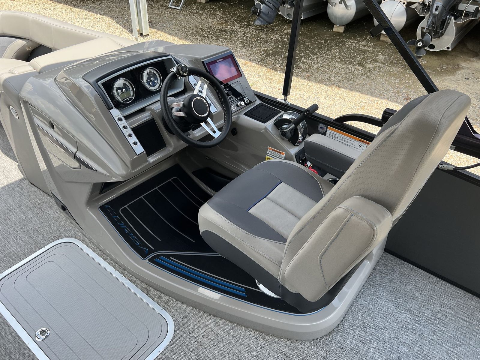 The Barletta Corsa 23UC is thoughtfully designed with features that enhance both comfort and functionality. Its spacious 23-foot deck provides plenty of room for guests to move around, lounge, and enjoy the scenery. The modern design elements and high-quality materials used throughout the boat create an inviting and stylish atmosphere. The seating is plush and ergonomically designed, ensuring that everyone on board can relax in comfort during long days on the water. The layout is optimized for socializing, with ample seating areas that encourage conversation and connection.This pontoon boat is also equipped with practical features that make every outing more enjoyable. The intuitive helm station puts you in complete control, with easy-to-read gauges and responsive controls that make navigation a breeze. The deck layout allows for easy movement and access to all areas of the boat, while the sturdy construction ensures safety and stability even in choppier conditions. The Barletta Corsa 23UC is built to last, with attention to detail evident in every aspect of its design.