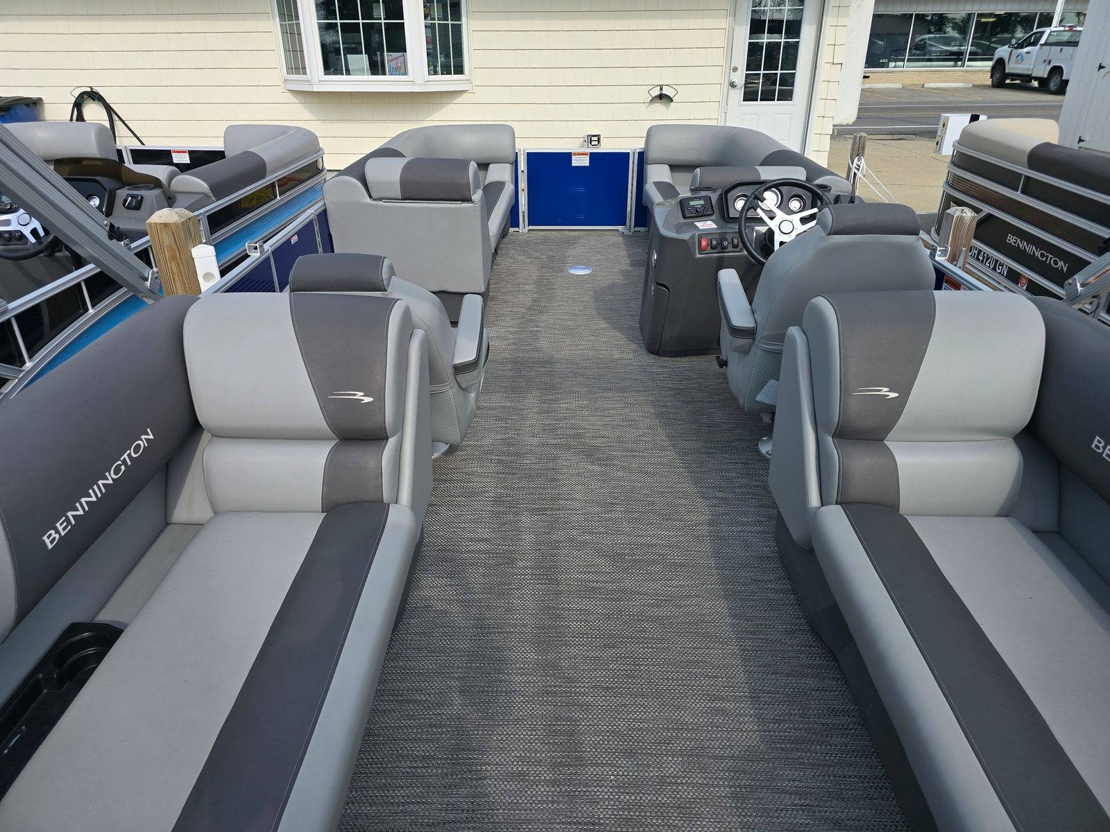 This Bennington pontoon boat for sale is packed with features designed to enhance your boating experience. The Canvas in Luminous Blue not only adds a vibrant touch but also provides shade and protection from the elements. The Seagrass Silver Full Flooring offers a luxurious, slip-resistant surface that’s easy to clean and comfortable underfoot. The Ext Aft Deck STD Trim S SPS extends your usable space, perfect for lounging, fishing, or preparing for water sports. The Dimensional Brushed Logo and Base Furniture with Simtex Upholstery elevate the interior, combining durability with a modern aesthetic. The No Accent - Textured finish and Metallic Luminous Blue panel create a cohesive, sophisticated look that stands out on the water.
