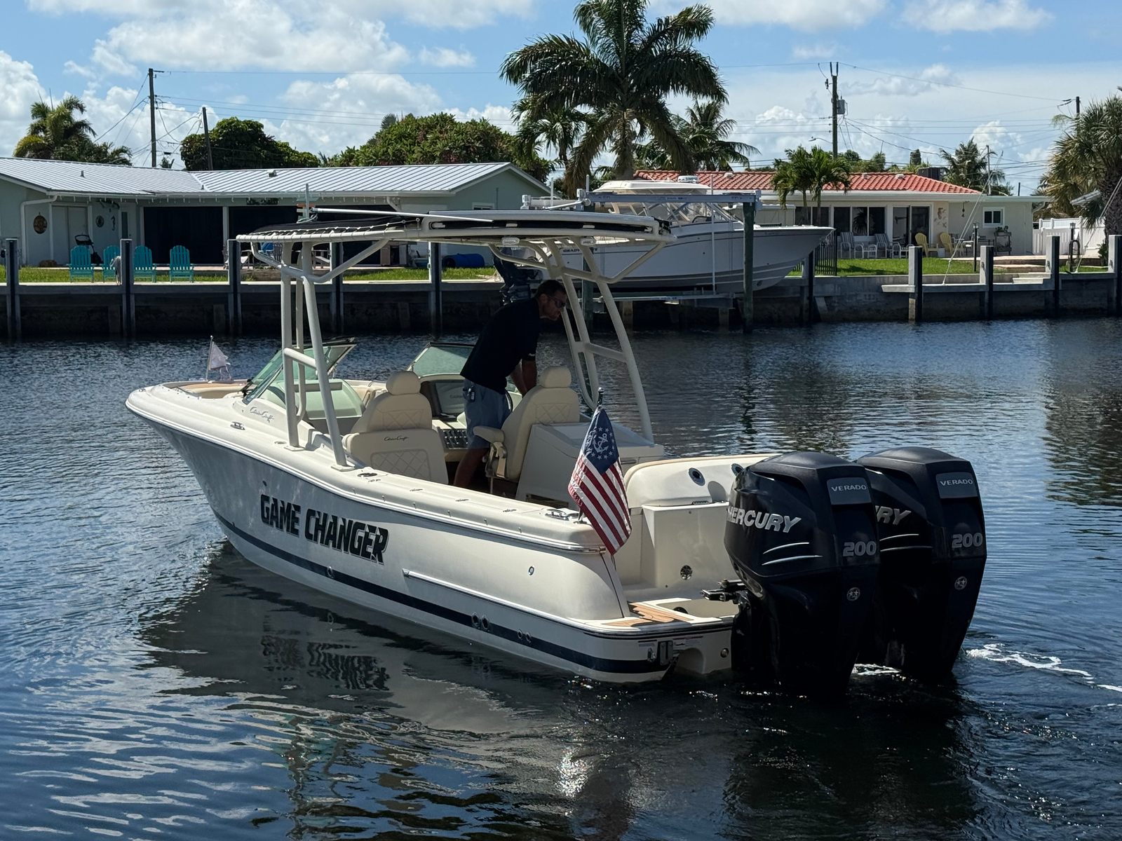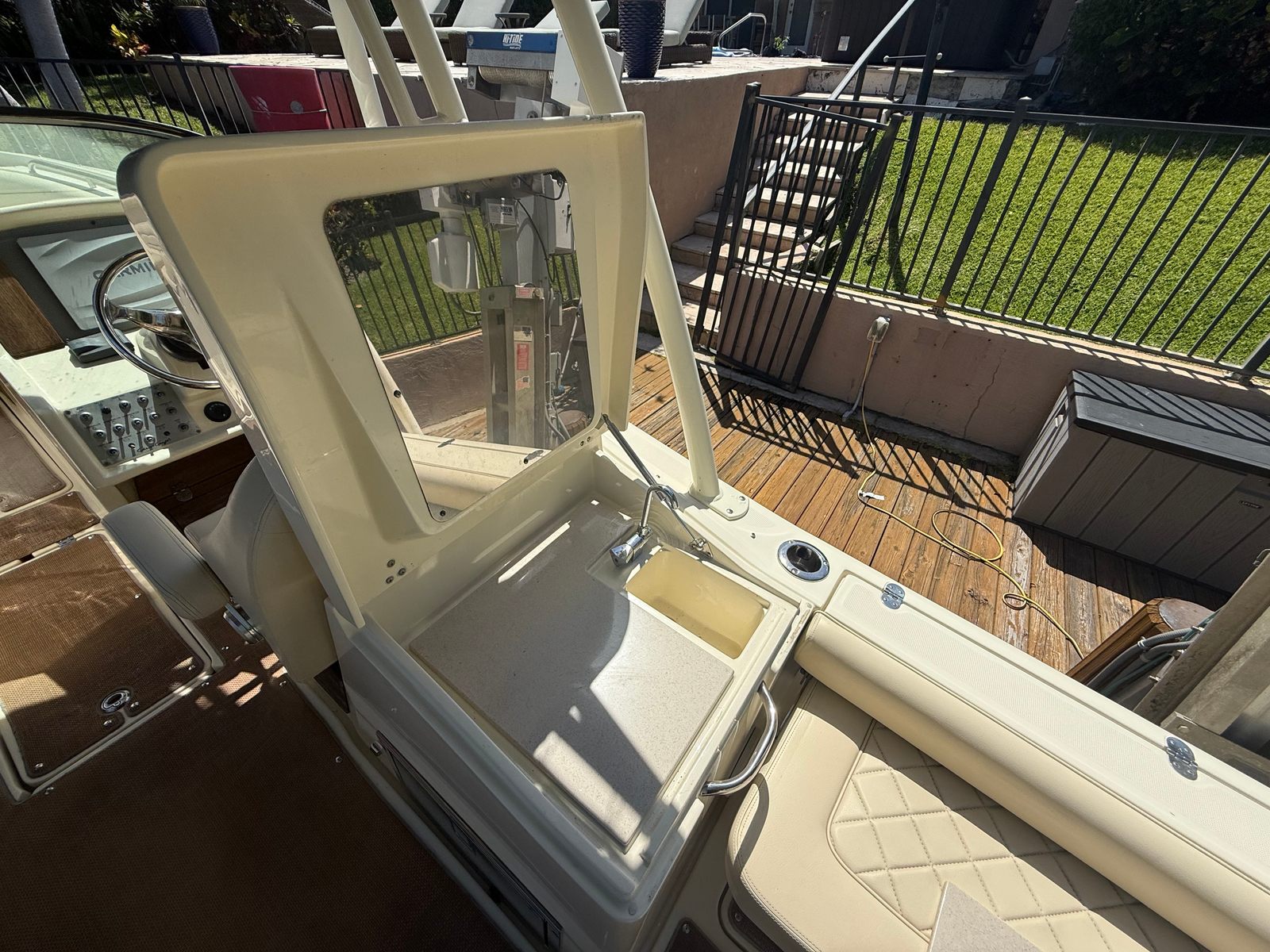 • Powder Coated Sport Arch with oversized Bimini Top and retractable aft sunshade