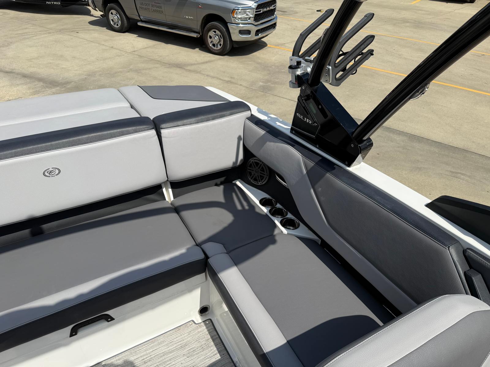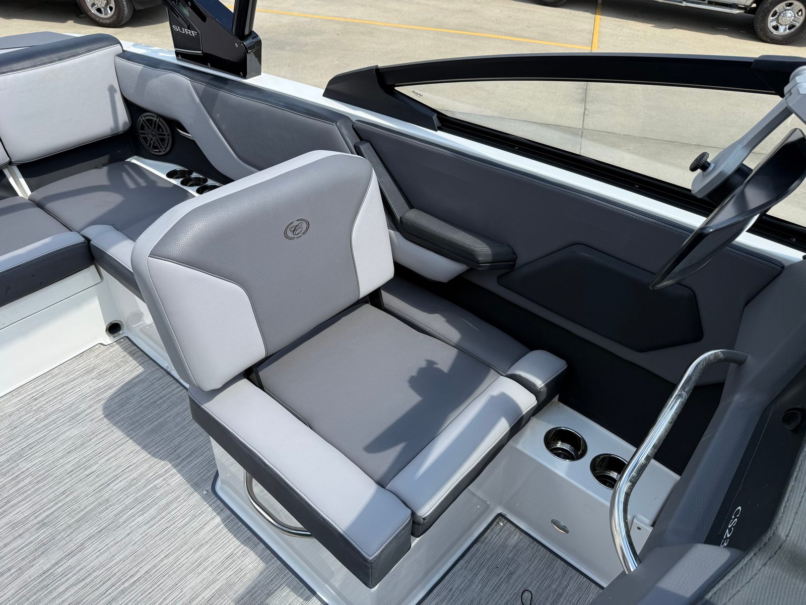 The 2024 Cobalt CS23 Surf is packed with features that enhance both its performance and comfort. As a bowrider, it offers an open and inviting layout, with plush seating in the bow and cockpit areas, allowing guests to relax and socialize with ease. The boat’s 23.4-foot length provides plenty of room for family and friends, making it perfect for group outings.Special features on the CS23 Surf include a surf-specific hull design that creates ideal wakes for wake surfing and other water sports. The intuitive controls and surf system allow you to customize the wave shape and size, ensuring a tailored experience for riders of all skill levels. The high-quality materials and finishes throughout the boat reflect Cobalt’s commitment to luxury and durability, while the ergonomic helm station puts all controls within easy reach for the captain.With its stylish lines, premium upholstery, and attention to detail, the CS23 Surf is as visually impressive as it is functional. The open bow area is perfect for sunbathing or enjoying the breeze, while the spacious cockpit provides a comfortable gathering spot for conversation and refreshments.