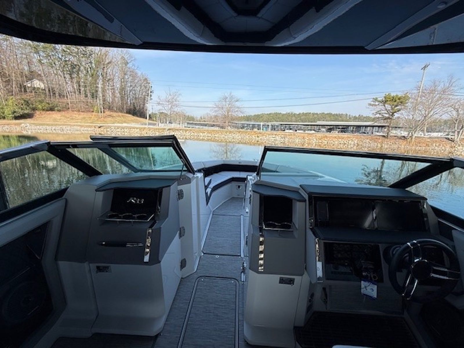 Comfort and amenities are front and center. The hydraulic swim platform with flip-down step creates effortless water access, while underwater RGB lighting and transom lighting set the tone at anchor. A Platinum Harman Kardon sound system with hardtop and transom speakers delivers impressive audio throughout the boat, and the wide, open seating layout makes it easy to host family and friends all day long.