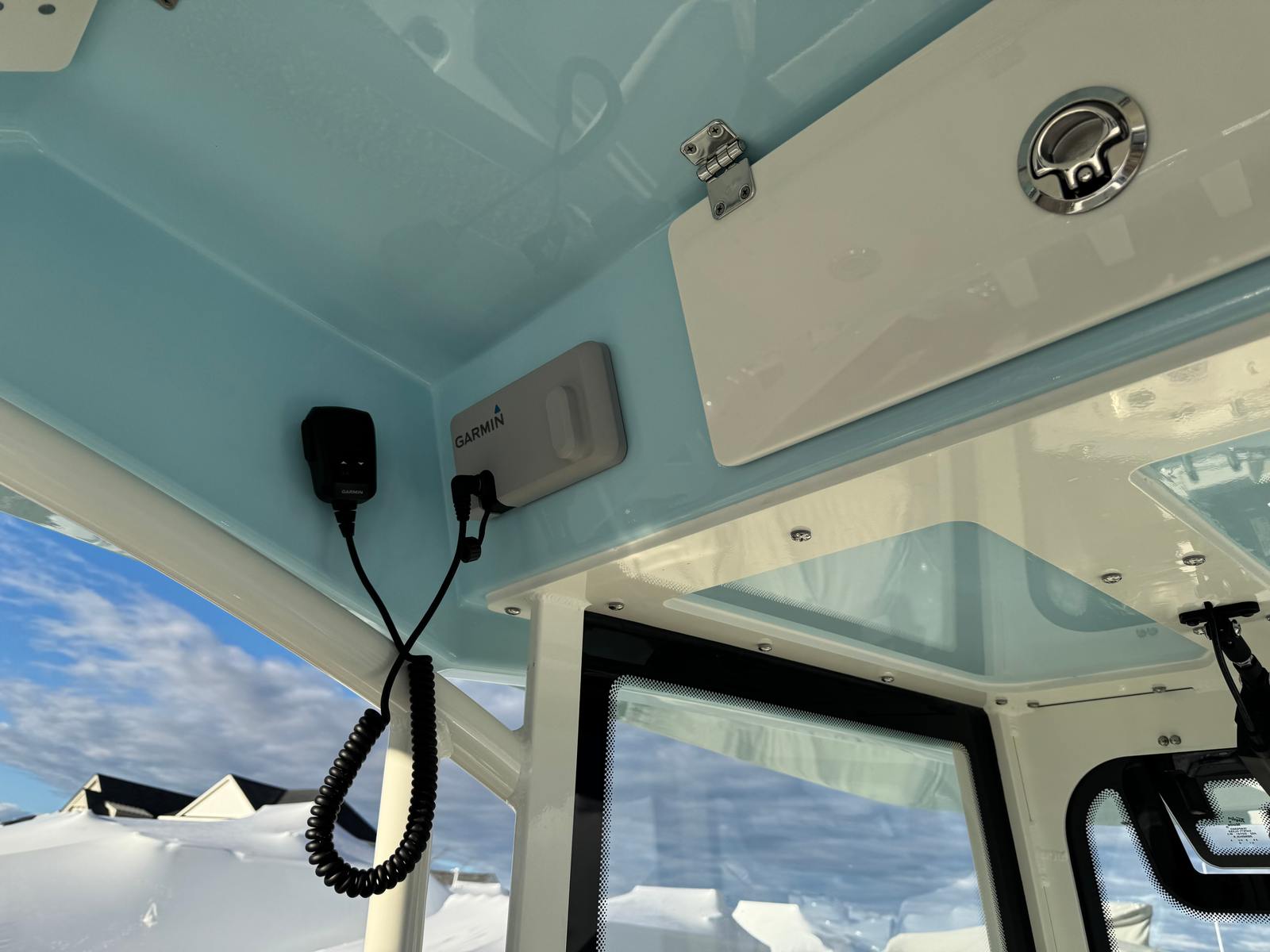 This center console boat is loaded with premium features that elevate both functionality and comfort. The Seakeeper Ride trim tabs and indicators provide superior stability and control, allowing you to fine-tune your ride for optimal performance in varying conditions. The hardtop with an integrated frame and glass windshield offers excellent protection from the elements, while the white powder coating adds durability and a modern aesthetic. The helm seat comes standard with a tackle station, making it easy to organize your gear and stay ready for action. Plush white cushions throughout the boat create a clean, inviting atmosphere, perfect for relaxing after a day of excitement. The electric head with a macerator and port window ensures convenience and privacy, enhancing the overall comfort for you and your guests.