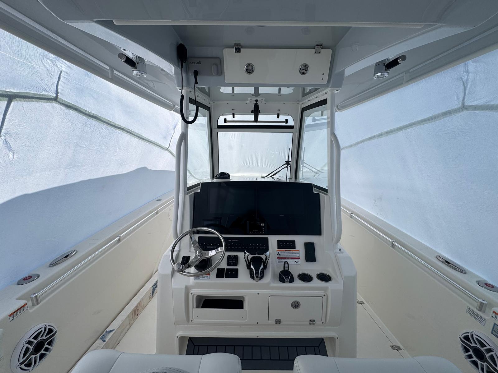 The Cobia 320 CC is loaded with special features that elevate your boating experience. The hull’s solid Whisper Grey color exudes modern elegance, while the two-tone Platinum and White cushion package adds a touch of luxury to every seat. The Bow Cushion Package ensures that the forward seating area is as comfortable as it is stylish, perfect for lounging in the sun or enjoying a scenic cruise. Faux teak decking in grey and black not only enhances the boat’s visual appeal but also provides a durable, non-slip surface underfoot.One of the standout features is the hardtop with an integrated frame and glass windshield, offering superior protection from the elements while maintaining clear visibility. The white powder coating on the hardtop frame adds durability and a clean, polished look. For those sunny days when you want extra shade, the bow sun shade provides a cool retreat, allowing you and your guests to relax in comfort. Trim tabs and indicators are seamlessly integrated, giving you the ability to fine-tune your ride for maximum performance and stability.
