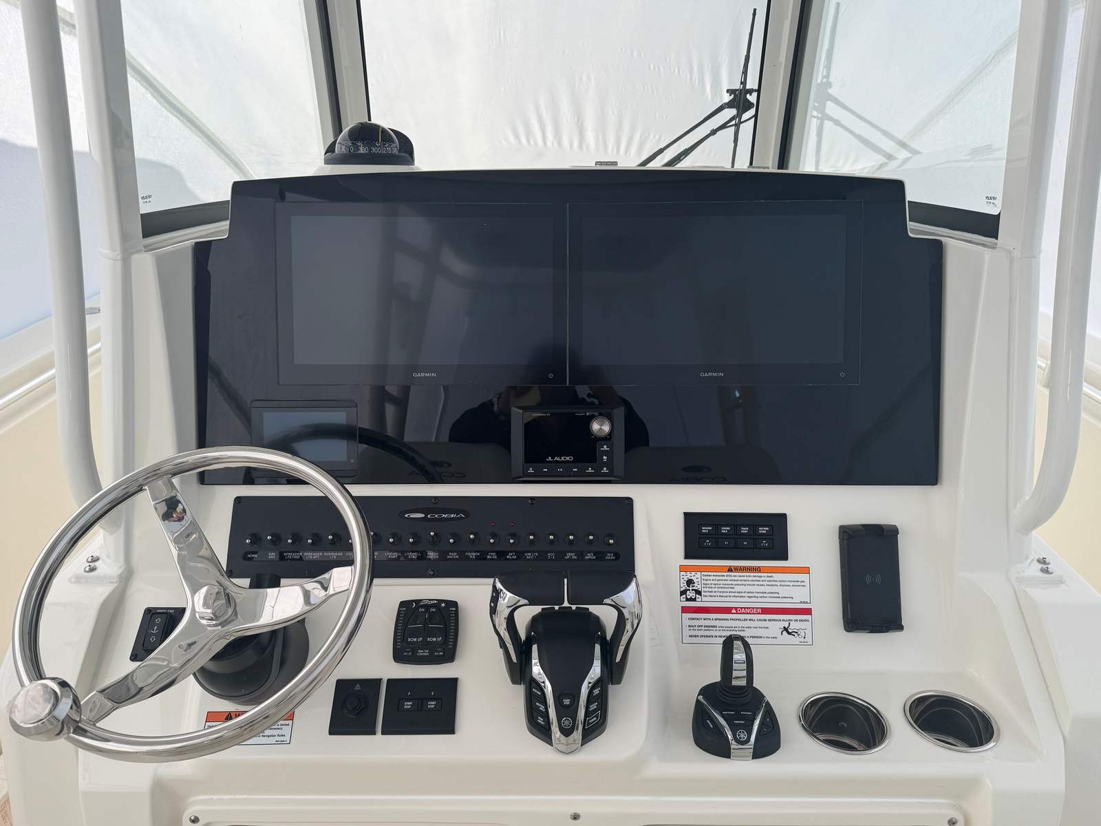 At the heart of the Cobia 320 CC is a powerhouse of performance. Equipped with twin Yamaha F350XSA2 engines in a striking white finish, this center console boat delivers a combined 700 horsepower. These engines are renowned for their reliability, smooth operation, and impressive acceleration, ensuring you have all the power you need for offshore adventures or quick trips to your favorite spots. The advanced Helm Master EX DES TwinEngine system with AP/JOY and ISO Charger provides intuitive engine controls, allowing for precise maneuvering and effortless docking. Digital Electric Steering further enhances the handling experience, giving you confidence and control at any speed. With trim tabs and indicators, you can easily adjust your ride for optimal comfort and efficiency, making every journey smooth and enjoyable.