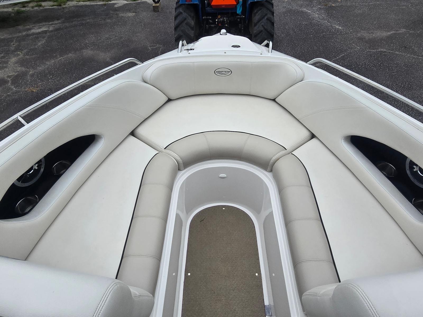 The Ebbtide 2300 Bowrider is designed with both functionality and style in mind. Its spacious bow seating area invites guests to relax and soak up the sun, while the open cockpit layout ensures everyone has plenty of room to move about comfortably. The high-quality upholstery and ergonomic seating provide lasting comfort, making long days on the water a pleasure. The intuitive helm station offers excellent visibility and easy access to controls, allowing the captain to navigate with confidence and ease.With a length of 23 feet, this bowrider offers generous storage options for all your gear, from water toys to picnic essentials. The thoughtful layout ensures that everything has its place, keeping the deck clutter-free and maximizing usable space. Whether you’re planning a day of water sports or a leisurely cruise, the Ebbtide 2300 is equipped to handle it all.