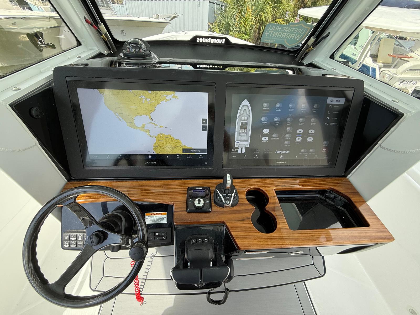 The Everglades 335 CC is designed with practicality in mind, making ownership both enjoyable and convenient. The intuitive joystick control and auto pilot system simplify docking and maneuvering, reducing stress and allowing you to focus on enjoying your time on the water. The engine flushing system streamlines maintenance, helping you keep your boat in top condition with minimal effort.Ample storage space ensures you can bring along all the gear and supplies you need for a day of fishing, water sports, or relaxation. The boat’s efficient design and powerful engines provide excellent fuel economy, allowing you to spend more time on the water and less time refueling. The lighting package, including the Lumitec lightbar and spotlights, enhances safety and visibility during nighttime outings, giving you peace of mind no matter when you choose to set sail.