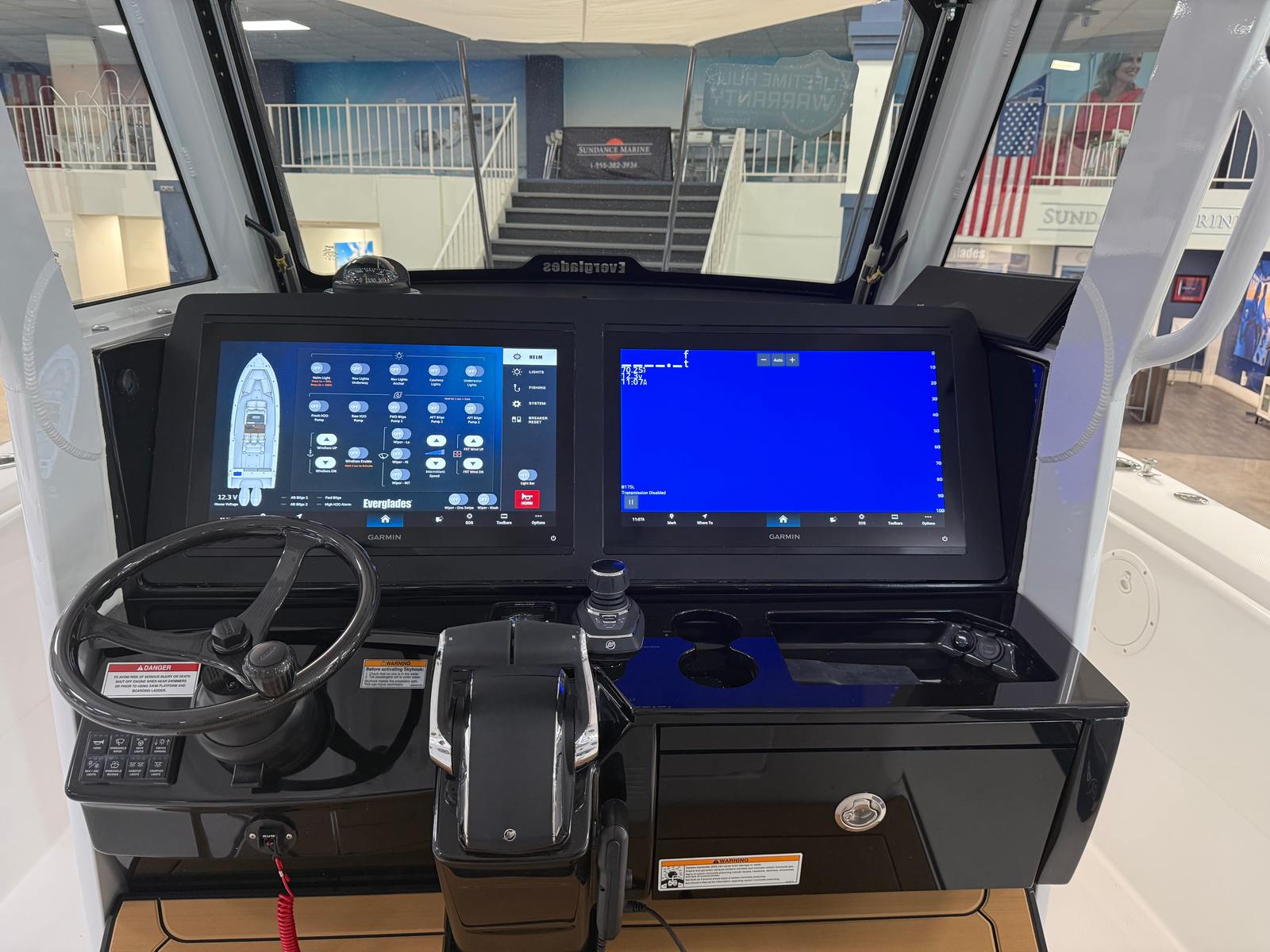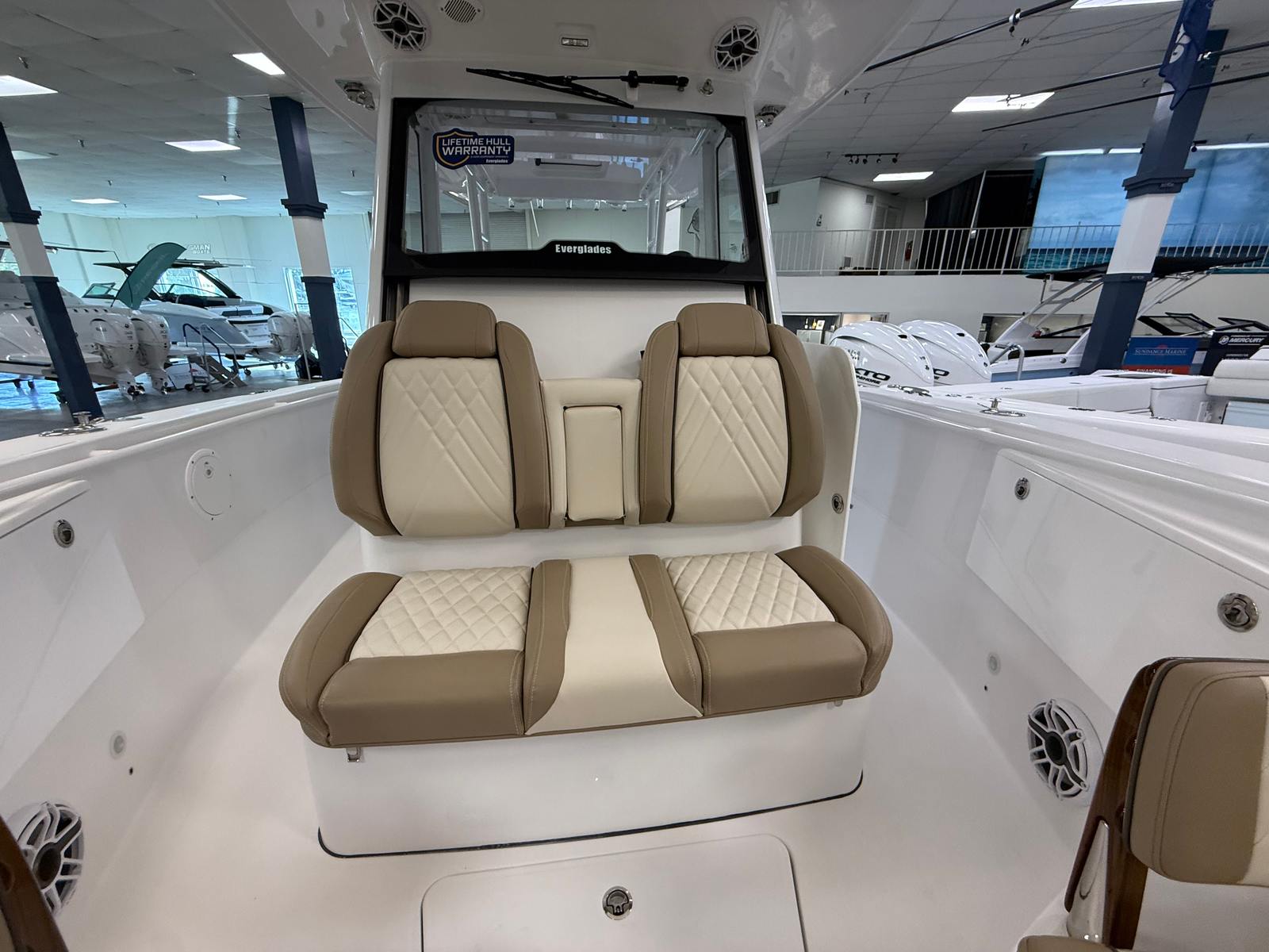 Power and precision are at the heart of the Everglades 335 CC. Equipped with twin Mercury V10 Cold Fusion engines, each delivering 425 horsepower, this center console boat offers a combined 850 horsepower for exhilarating acceleration and top-end speed. The advanced Mercury engines are renowned for their reliability, smooth operation, and fuel efficiency, making them a perfect match for the Everglades 335 CC. The inclusion of an autopilot system and joystick control for the twin Mercury engines provides effortless handling and maneuverability, whether you are docking in tight spaces or navigating open waters. The carbon fiber steering wheel upgrade adds a touch of sportiness and comfort, ensuring that every journey is as enjoyable as it is thrilling.