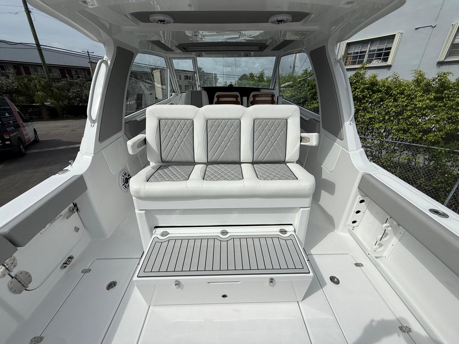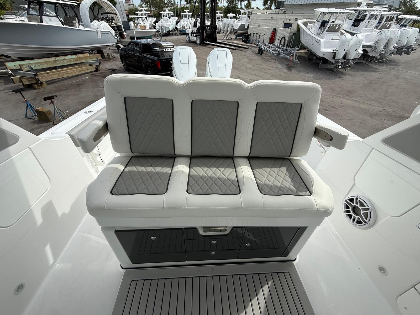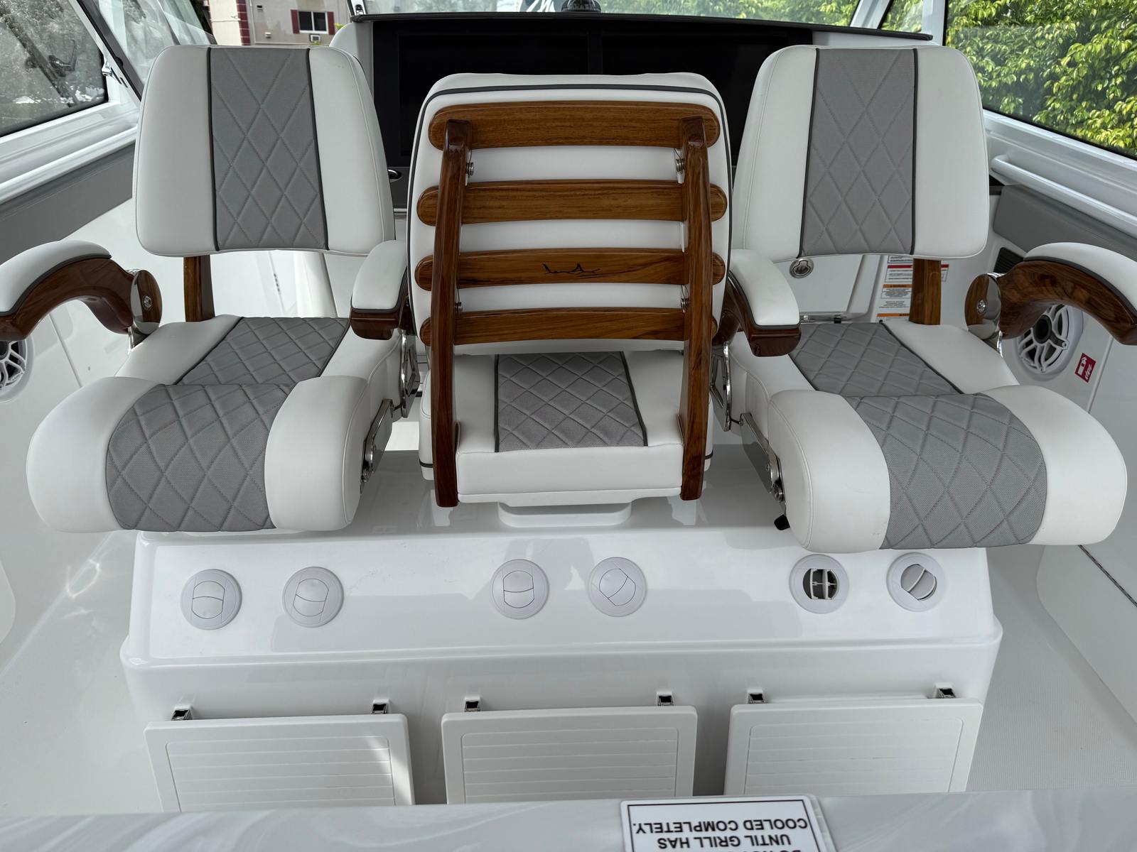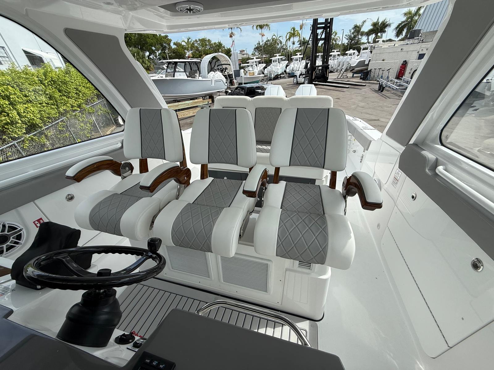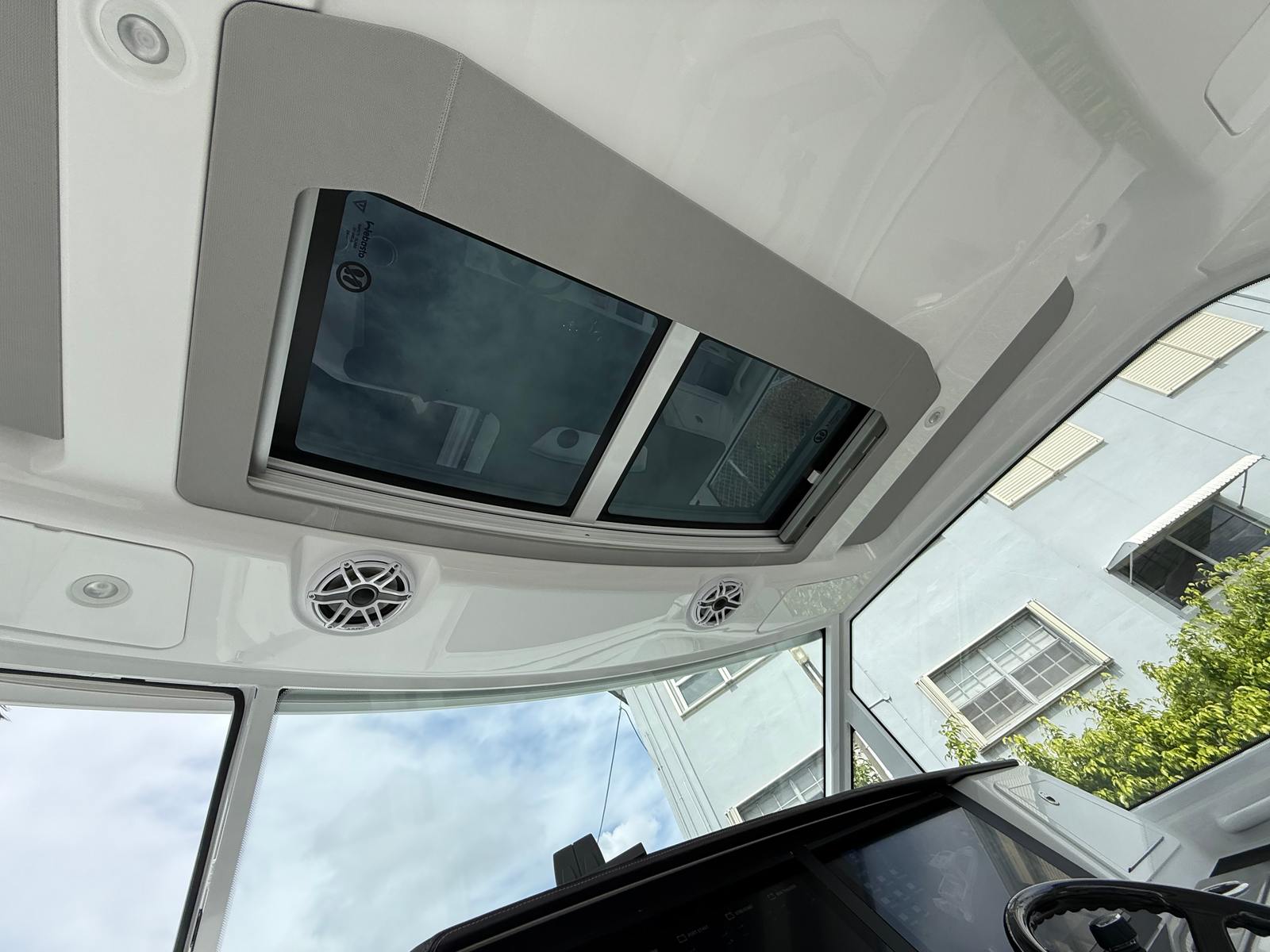 - **Carbon Fiber Steering Wheel Upgrade**: Enjoy a lightweight and durable steering experience with the premium carbon fiber steering wheel. - **Electrically Actuated Skylight and Retractable Cockpit Shade**: These features provide optimal lighting and shade control, allowing you to customize your comfort effortlessly. - **Hardtop Mounted and Electrically Actuated**: The hardtop is equipped with a Mediterranean bow shade and a triple low-profile light bar, ensuring both functionality and style. - **Fishing Package**: Tailored for fishing enthusiasts, this package includes essential gear and storage solutions to make your fishing trips more enjoyable. - **Electrically Actuated Valves on Thru Hulls**: Seamlessly manage your waste system and generator with the integrated valves, enhancing convenience and efficiency. - **Tow Package with Heavy-Duty Tow Eye**: Perfect for towing water sports equipment, ensuring you can bring along your favorite gear with ease. - **Upholstery Color Material Package - Sanibel**: The Sanibel upholstery package adds a touch of elegance and comfort to the interior, making every voyage a pleasure.