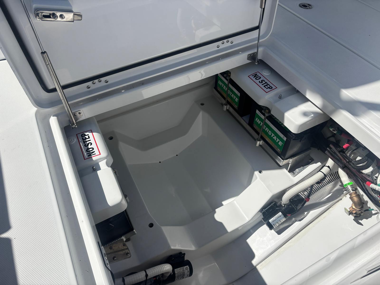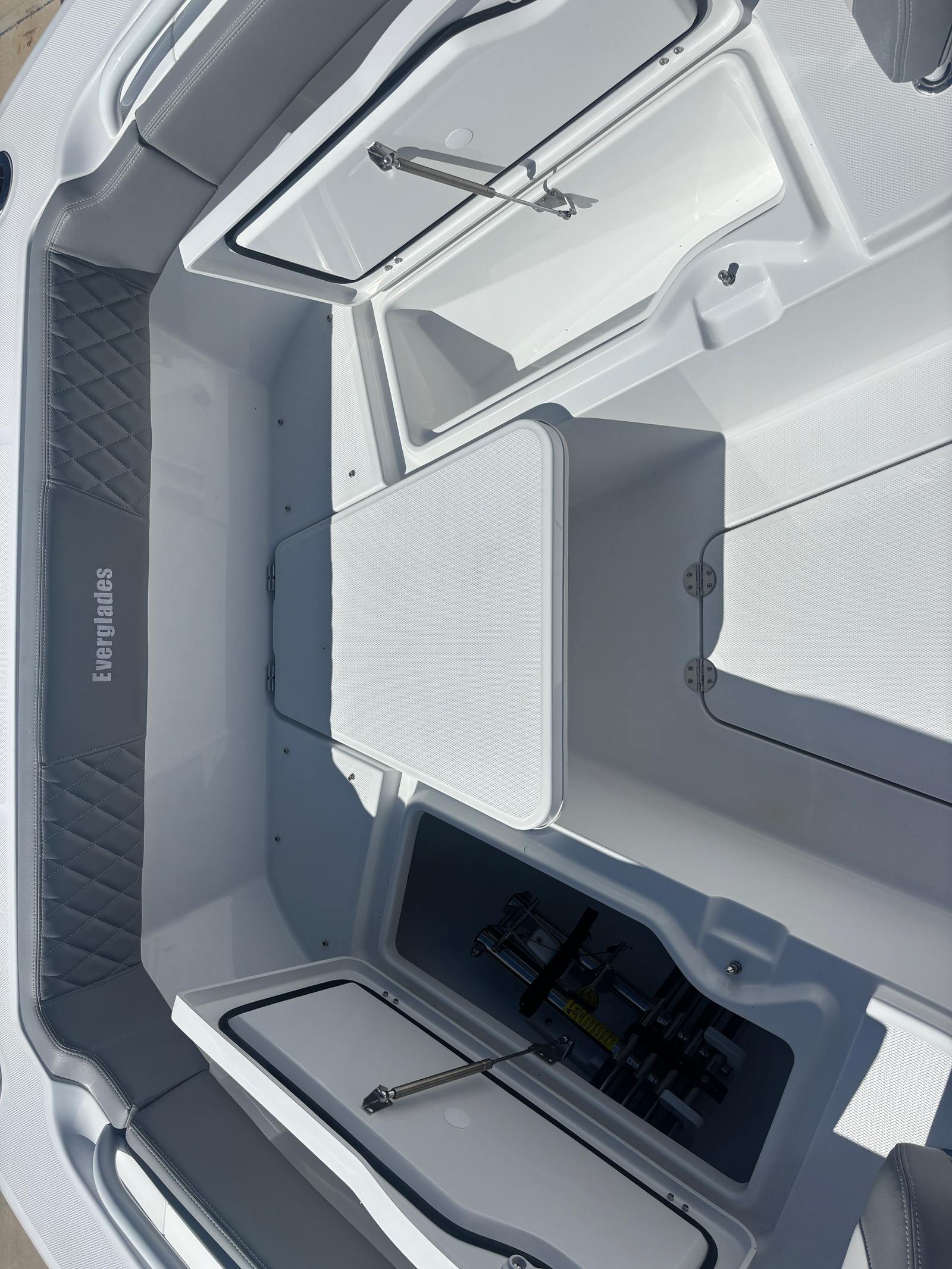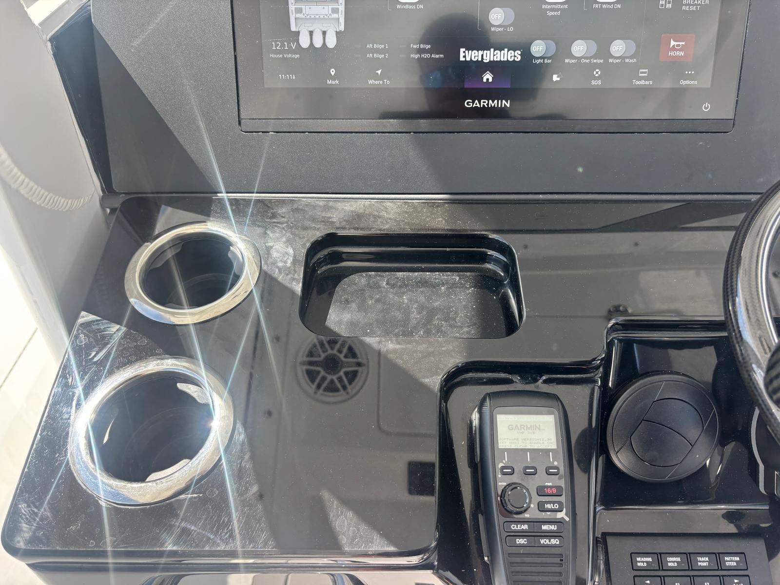 The Everglades 375 CC is as practical as it is luxurious. Its generous length and smart layout offer plenty of storage for gear, supplies, and personal items, keeping the deck clutter-free and organized. Docking is a breeze thanks to the Joystick control, allowing for precise movements in tight spaces. The efficient triple Yamaha engines not only deliver impressive power but also contribute to fuel efficiency, making longer trips more economical. Maintenance is simplified with the Engine Flushing System, and the electrically actuated valves add an extra layer of convenience and reliability.
