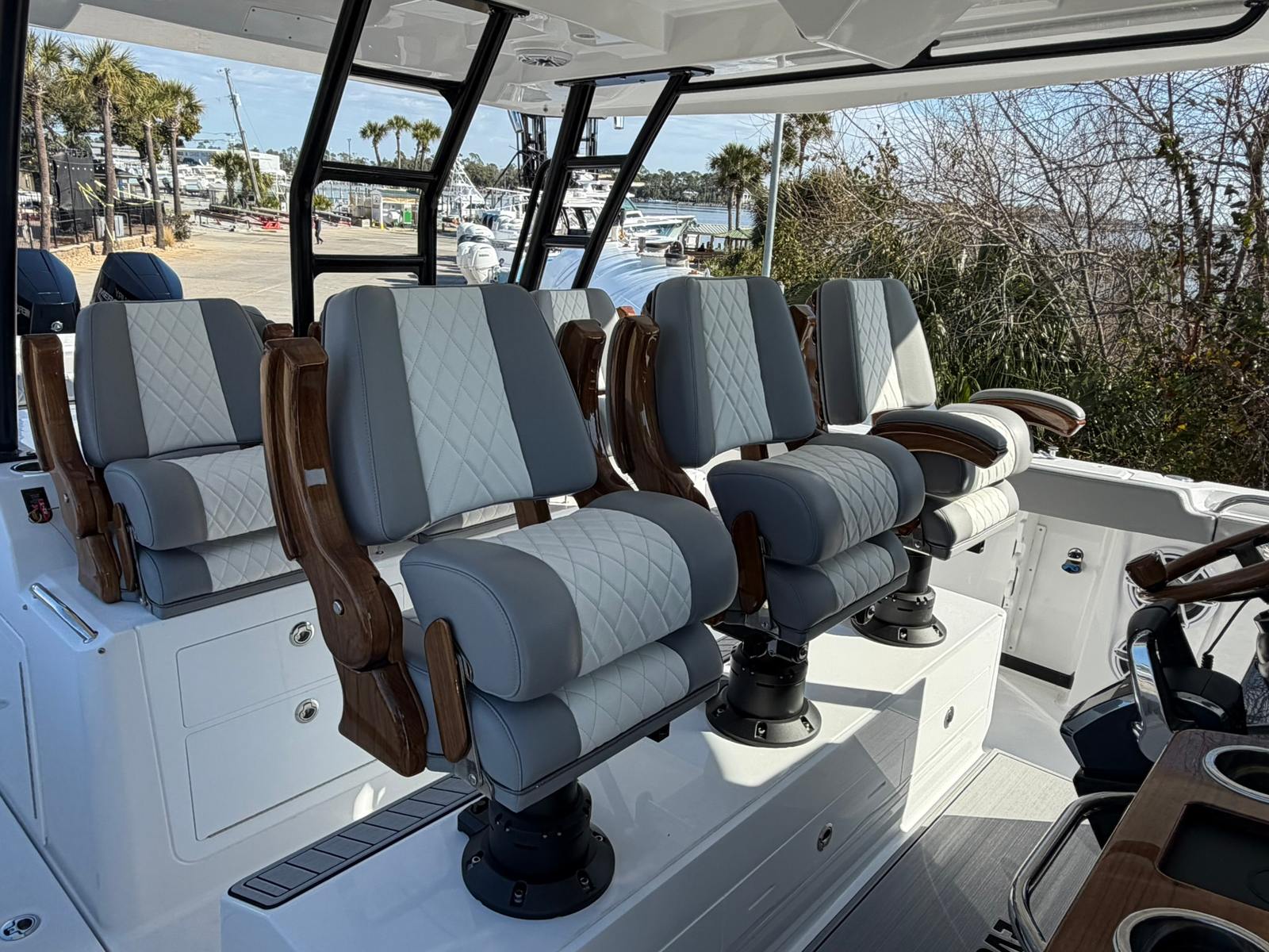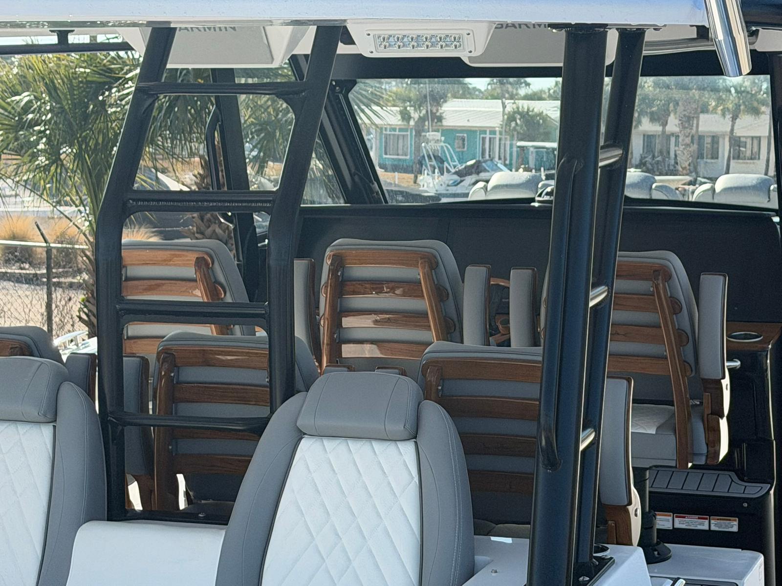 Step aboard the Everglades 455 CC and discover a world of premium features designed to enhance every aspect of your boating experience. The full upper station is equipped with autopilot and joystick controls, a sun top for shade, two drink holders, folding helm seat bolsters, a stainless steel grab rail, a glove box, a Garmin GHS 11 handset, and an additional Garmin 8616 screen. These features provide superior comfort and control, whether you are navigating from the main helm or enjoying the elevated views from the upper station.The interior showcases a sophisticated Ocean (Teak & Holly) cabinet color, complemented by Flint Gray accent upholstery for a modern and inviting atmosphere. The comprehensive canvas package includes covers for the forward console seat, console, helm seat, mezzanine seat, bow seats, second row, and forward rod/cup holders, ensuring your investment is well-protected from the elements. The Mediterranean bow shade in white offers additional comfort on sunny days, while the black canvas adds a touch of elegance and durability.For anglers and those who love to entertain, the aft fish box with one tub (no divider) provides ample storage for your catch or refreshments, making it easy to transition from fishing to socializing. Every detail of the Everglades 455 CC is thoughtfully designed to maximize convenience, comfort, and enjoyment on the water.