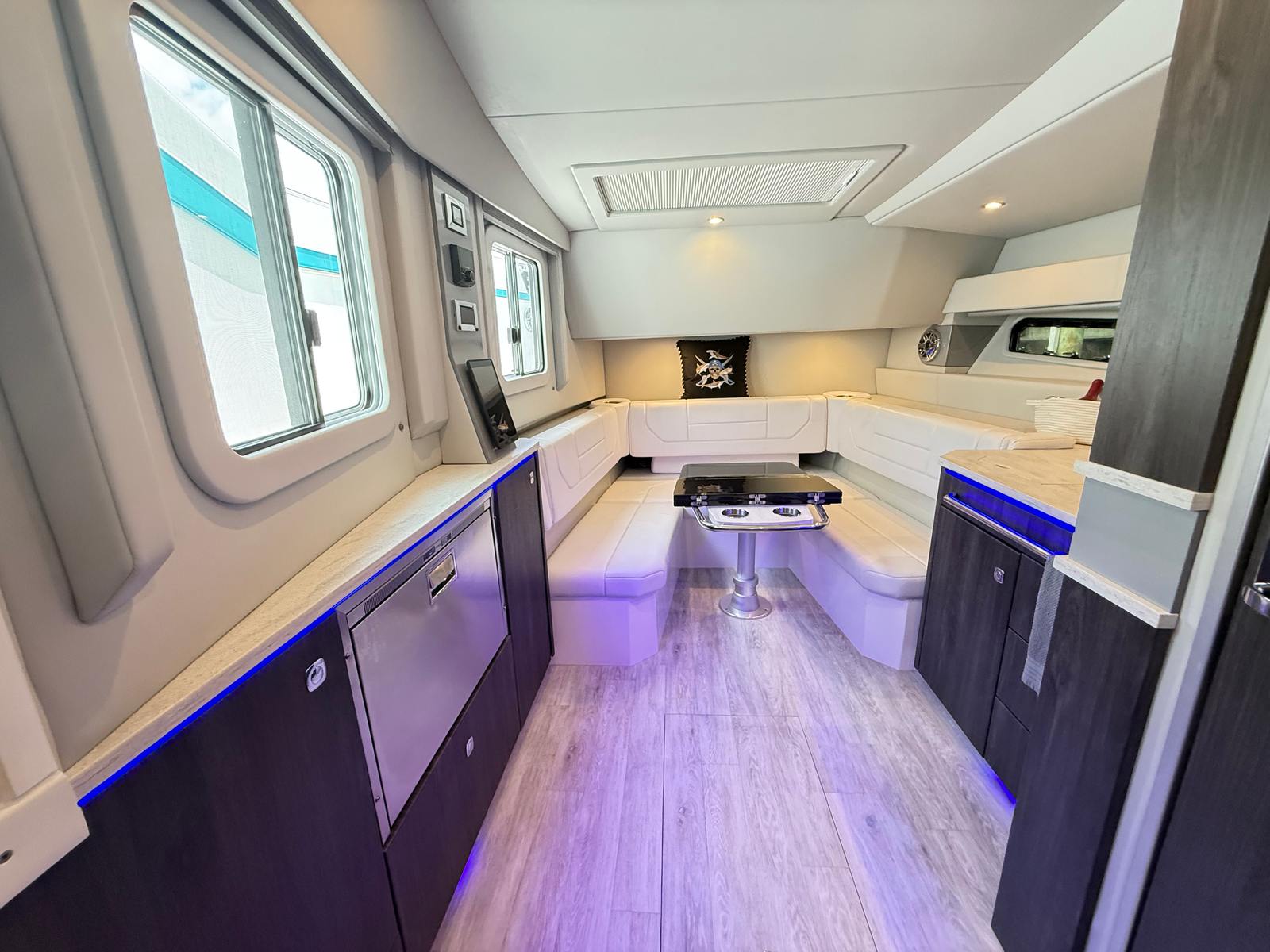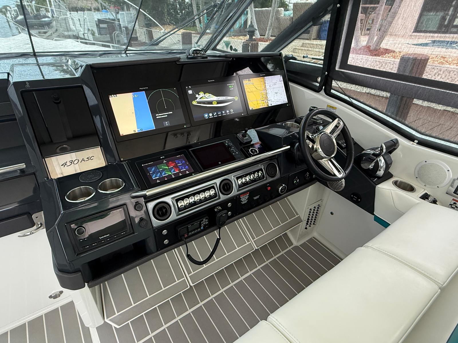 full height tinted windshield with wiper, port walk-thru door side wing glass vents and large, motorized opening coupe-top, glass sunroof with retractable sunshades and soft panels, blue LED accent lighting, dual flagstaff, flush mount LED spreader lights, flag staff and white dual air horn