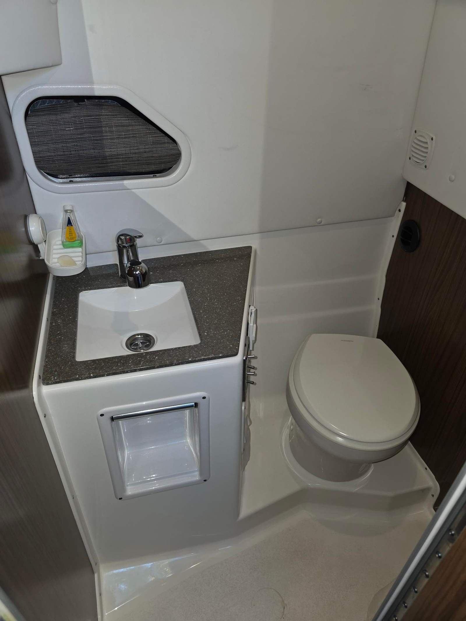 The V255 offers ample cabin space with a convertible V-bunk in the bow and a beam-width aft cabin accommodation. It can sleep up to six people, making it a spacious option for families or groups.