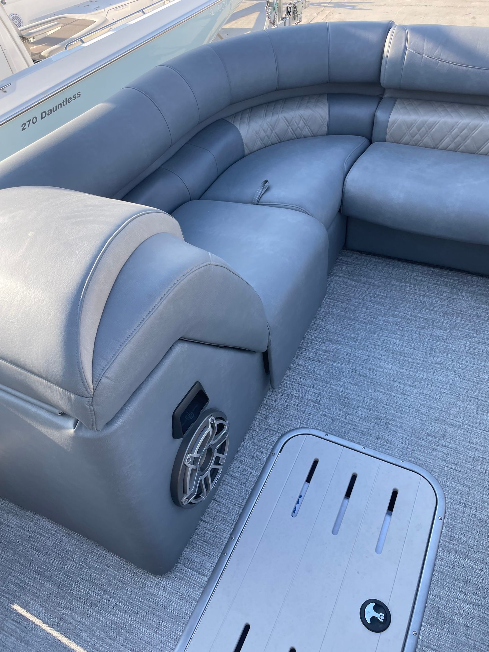 Practicality is at the heart of the Premier 270 Intrigue’s design. The spacious layout provides plenty of room for storing gear, coolers, and water toys, ensuring you’re always prepared for a day on the water. The pontoon’s length makes docking and maneuvering straightforward, while its stable hull design offers confidence in a variety of conditions. Fuel efficiency is enhanced by the modern engine, allowing you to spend more time cruising and less time refueling.This Premier boat for sale is ideal for owners who value convenience and ease of use. Its thoughtful design makes cleaning and maintenance simple, so you can focus on enjoying your time on the water. The sturdy construction and quality materials ensure durability, while the elegant finishes add a touch of sophistication to every outing.