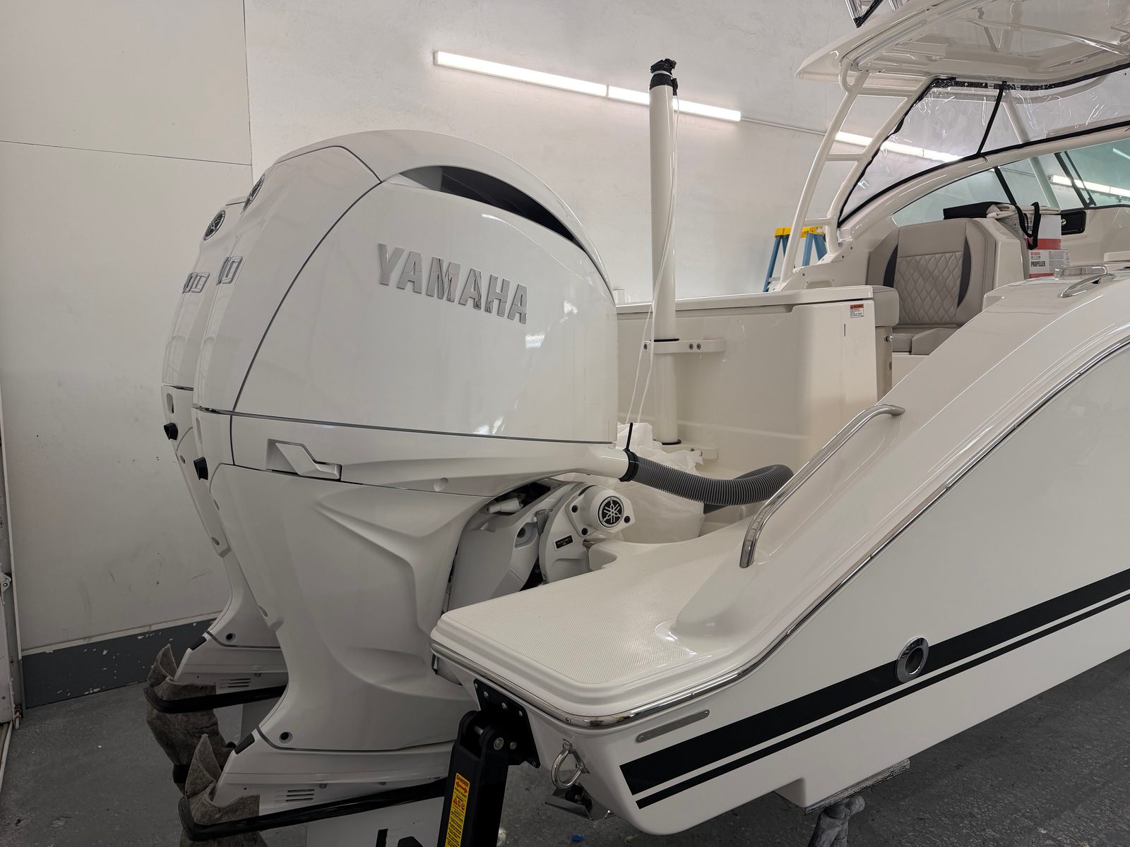 - Twin Yamaha® Digital F200 (Pearlescent White) with Digital Electronic Steering (DES)) and Helm Master® EX Digital Electronic Control (DEC) (does not include joystick control), Multifunction Display Interface