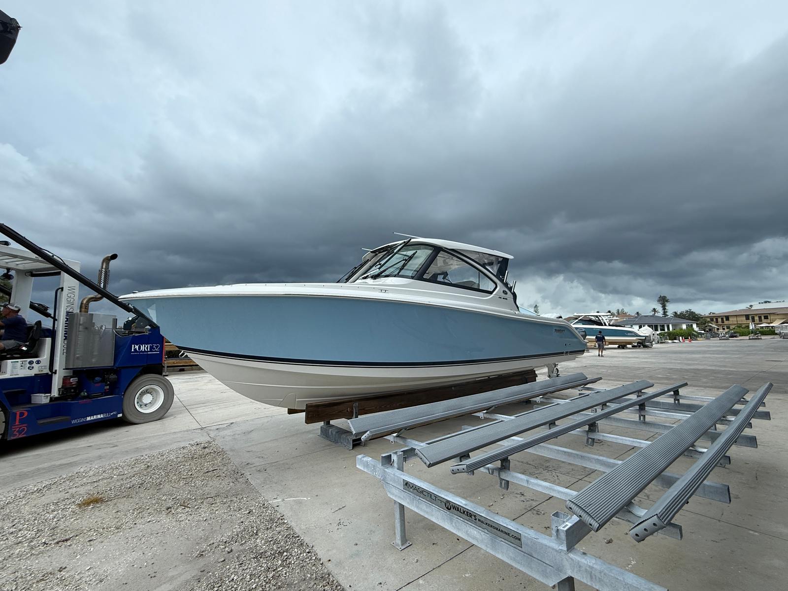 The Pursuit DC 306 is loaded with premium features designed to maximize comfort, convenience, and enjoyment. The Arctic Blue hull color not only adds visual appeal but also reflects Pursuit’s attention to detail. The hardtop is equipped with port and starboard Bomar hatches with screens, allowing for excellent ventilation while keeping the cabin protected from the elements. For those sunny days on the water, the aft Med style sunshade by Suntex is stowable, providing flexible shade options to suit your needs.Dockside power is made simple with the 110V/60HZ system and integrated battery charger, ensuring your electronics and amenities stay powered throughout your adventures. The blue drop curtain and blue side curtains offer additional protection from wind and spray, while the blue twin engine covers keep your engines shielded when not in use. The helm and footrest feature a sophisticated carbon color, adding a touch of modern elegance to the cockpit.