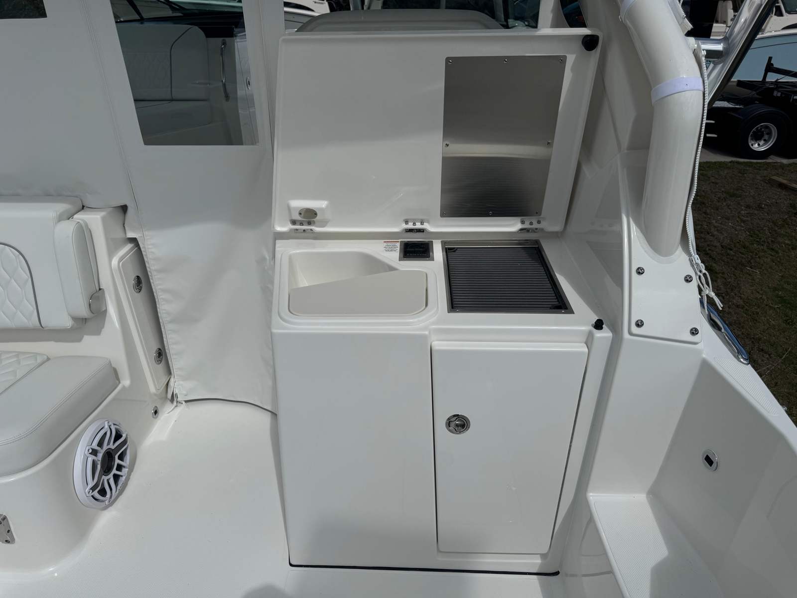 Step aboard the Pursuit DC 326 and discover a world of premium features designed to elevate your boating experience. The Flag Blue hull and Red boot stripe create a visually stunning profile, while the upgraded White/Gray upholstery and Tranquil Sea interior fabric provide a serene and inviting atmosphere. The helm, finished in sleek Carbon, offers a modern command center with intuitive controls and excellent visibility.Enjoy gourmet meals on the water with the 110V/60Hz cockpit grill, complete with a convenient drip pan for easy cleanup. The 120V/60Hz Fischer Panda 5.0kW generator, paired with a 16-gallon diesel tank, ensures reliable power for all your onboard systems, whether you are anchored in a quiet cove or entertaining guests at the dock. The air conditioning package with reverse cycle delivers comfort in any weather, featuring 6,000 BTU for the cabin and head, and 12,000 BTU for the cockpit (requires drop curtain). The bridge deck teak table with storage adds a touch of elegance and functionality, perfect for alfresco dining or social gatherings.