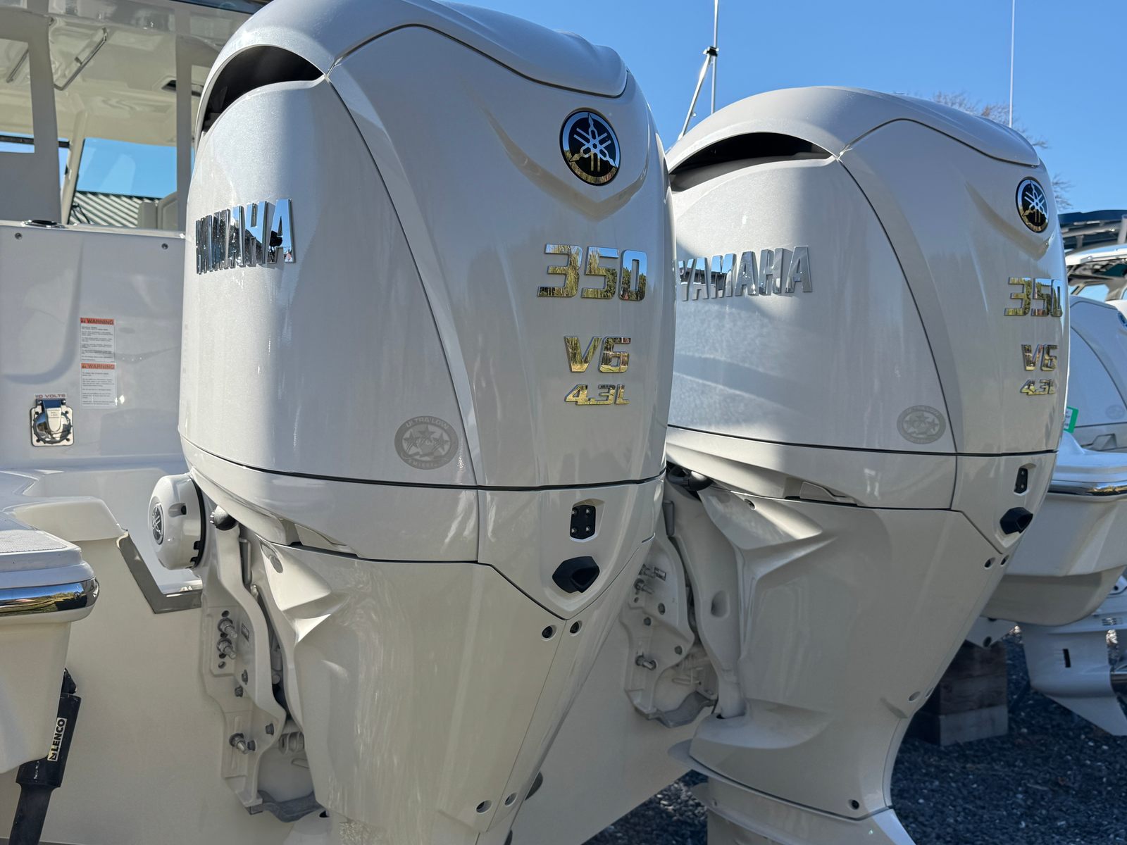 - Twin Yamaha Digital F350 V6 Offshore (Pearlescent White) w/Integrated Digital Electric Steering (DES) and Helm Master EX Digital Electronic Control (DEC) (does not include joystick control), Multifunction Display Interface and Manual Engine Flushing System