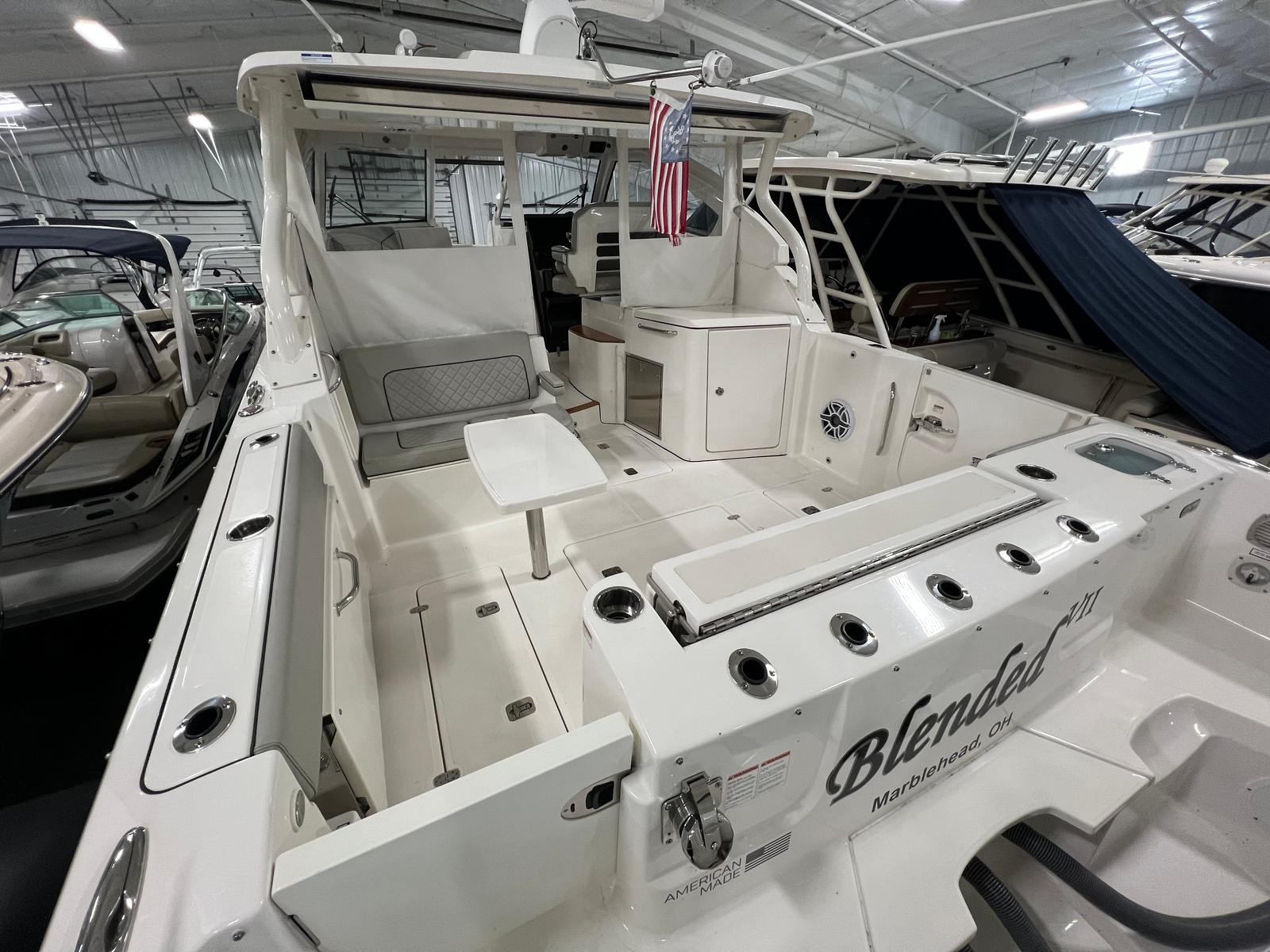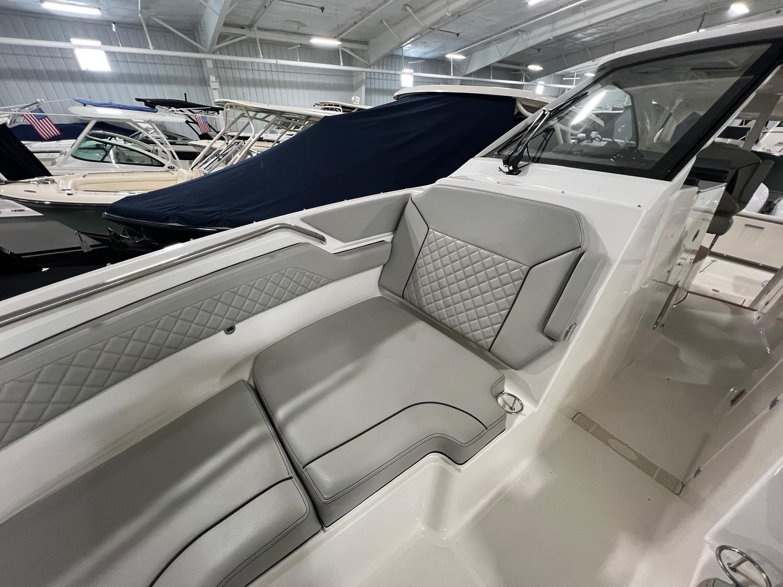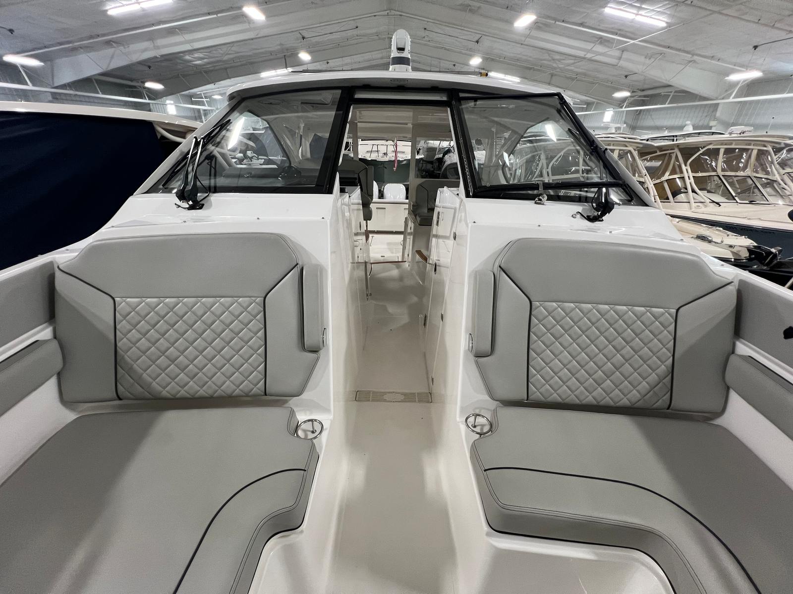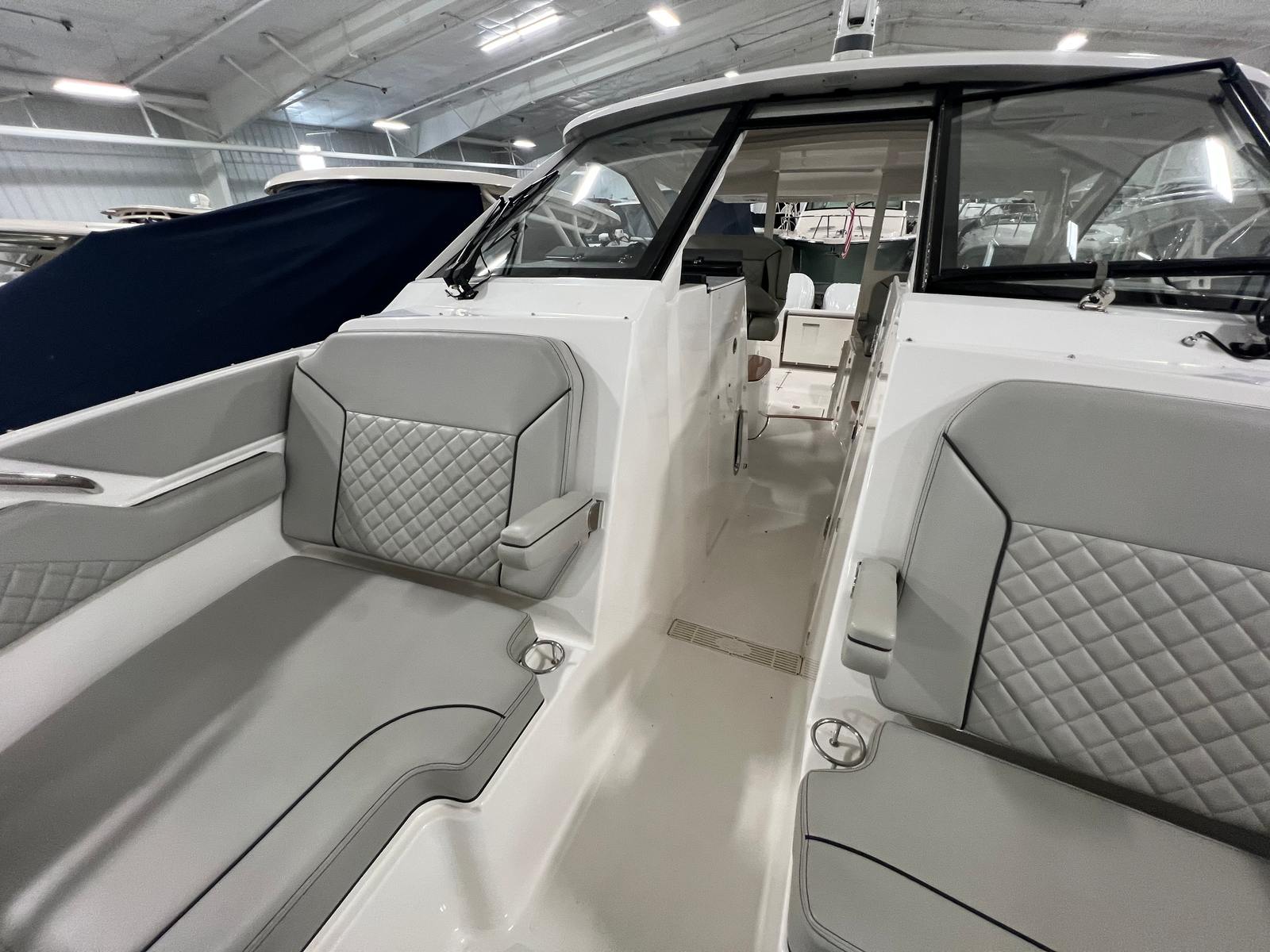 The versatile layout offers an open bow for enjoying sunny days on the water, a powered Mediterranean shade that provides instant relief from the sun, and the ability to fully enclose the helm area when the weather shifts. The boat also features comfortable seating throughout, premium helm electronics, ample storage, a well-appointed cabin, and a head for extended days on the water.