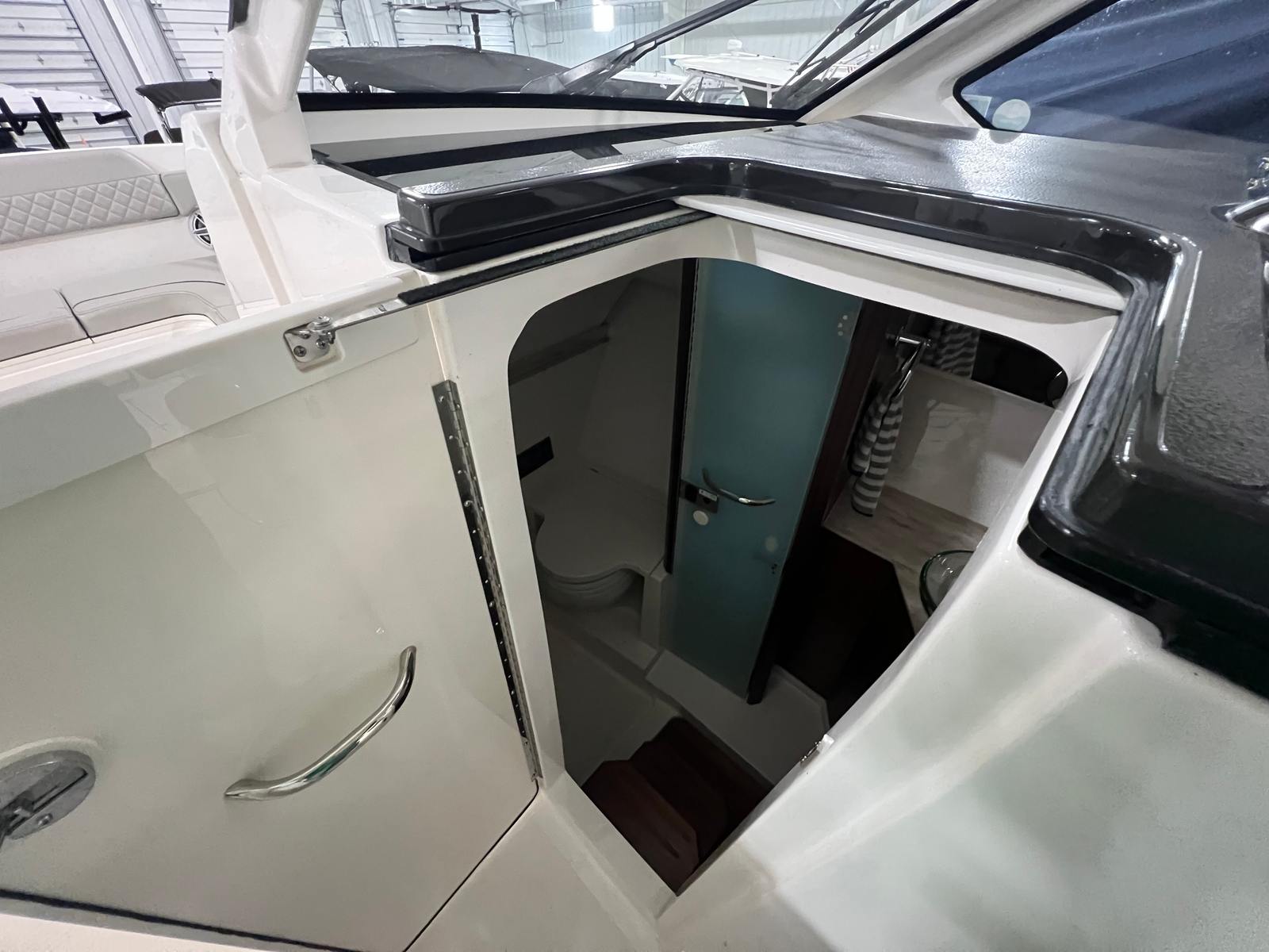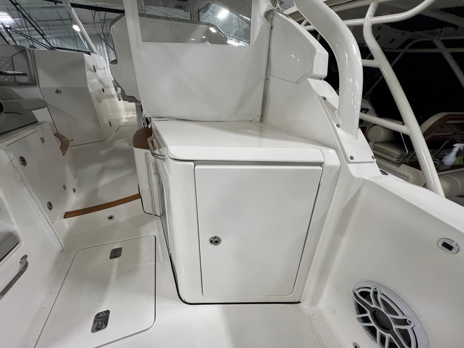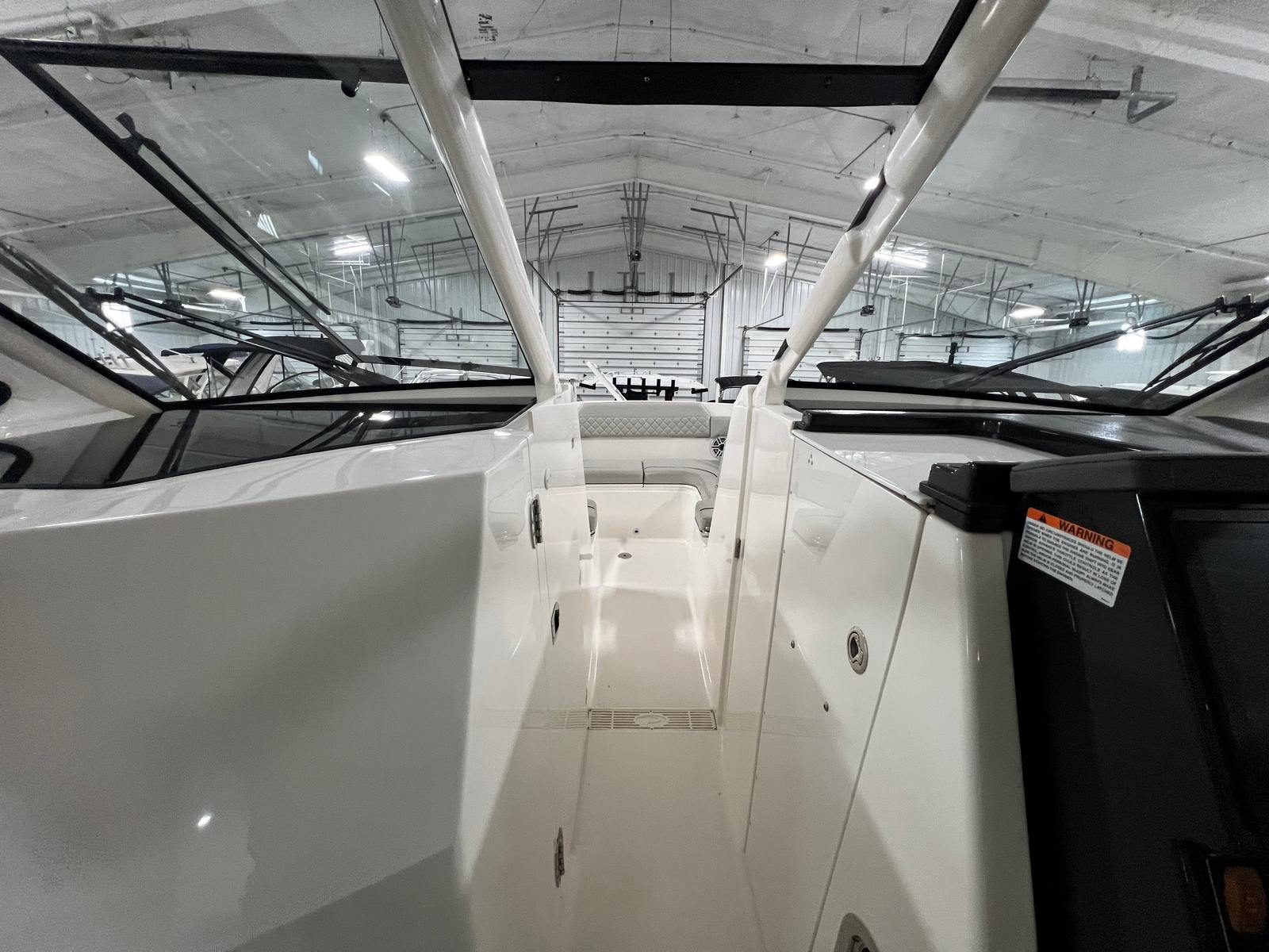 The versatile layout offers an open bow for enjoying sunny days on the water, a powered Mediterranean shade that provides instant relief from the sun, and the ability to fully enclose the helm area when the weather shifts. The boat also features comfortable seating throughout, premium helm electronics, ample storage, a well-appointed cabin, and a head for extended days on the water.