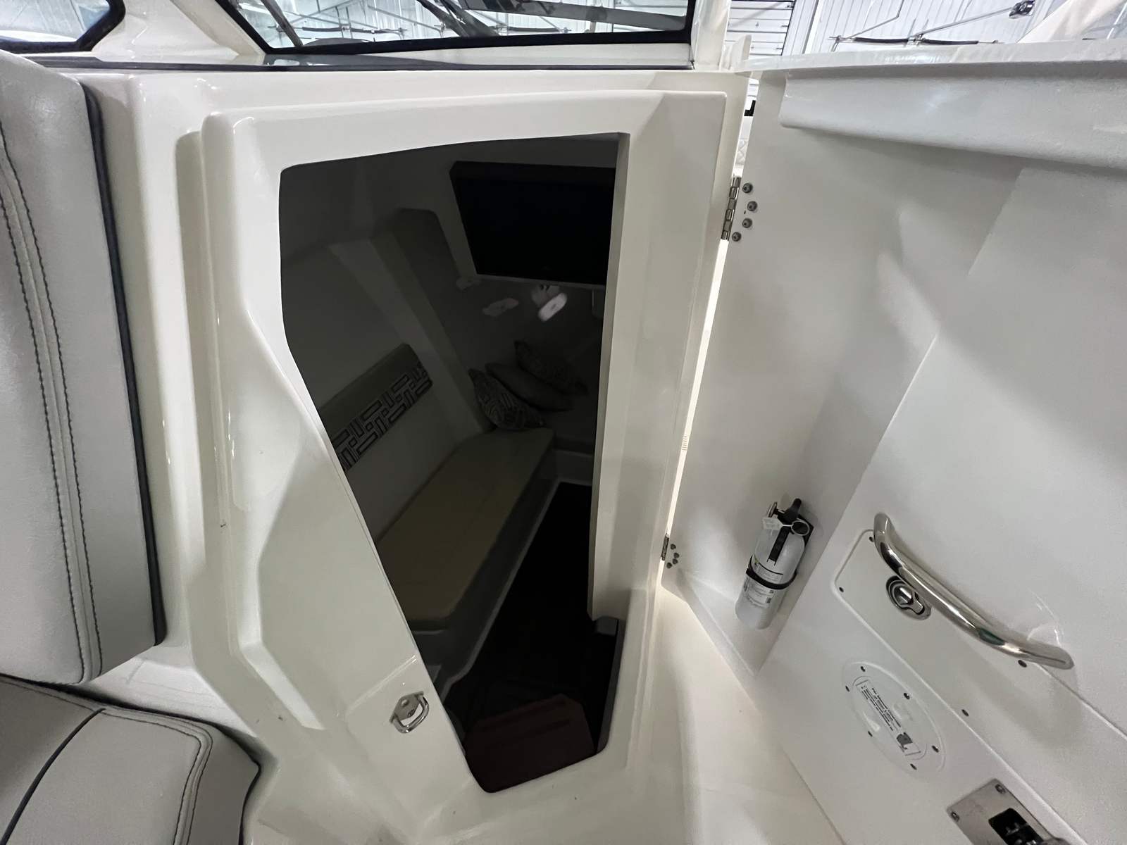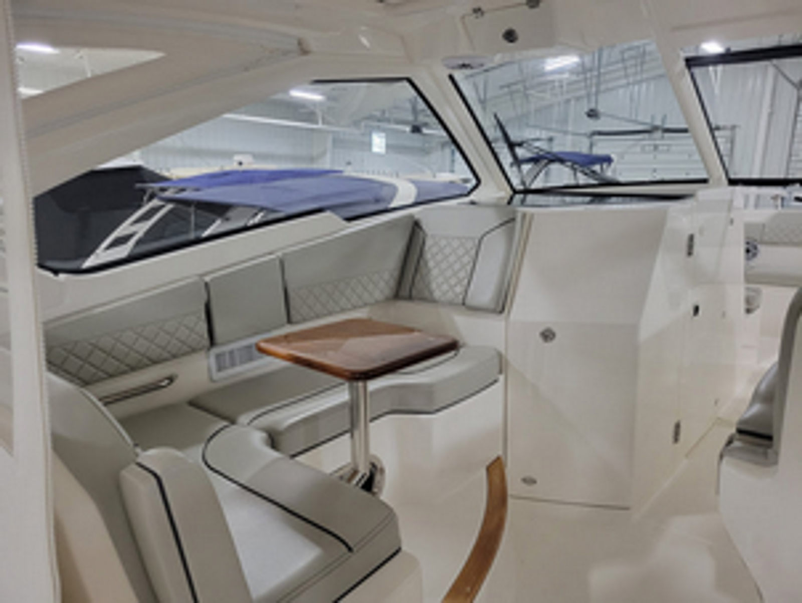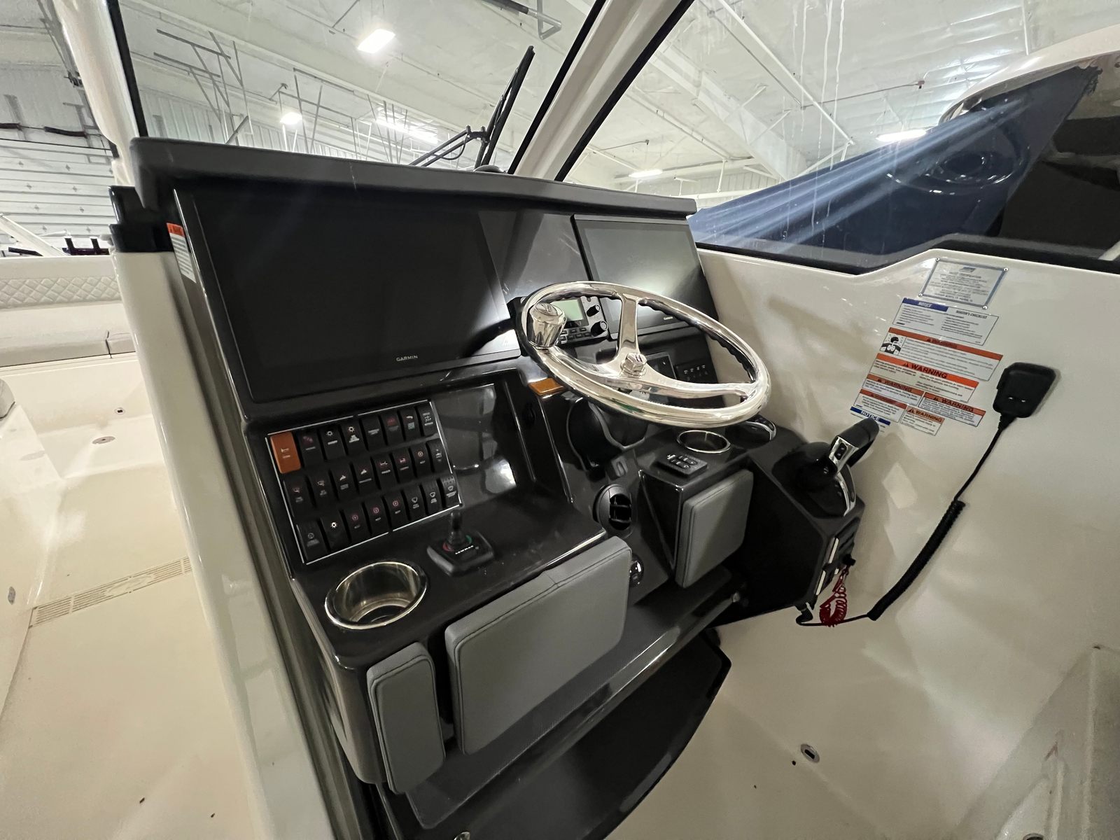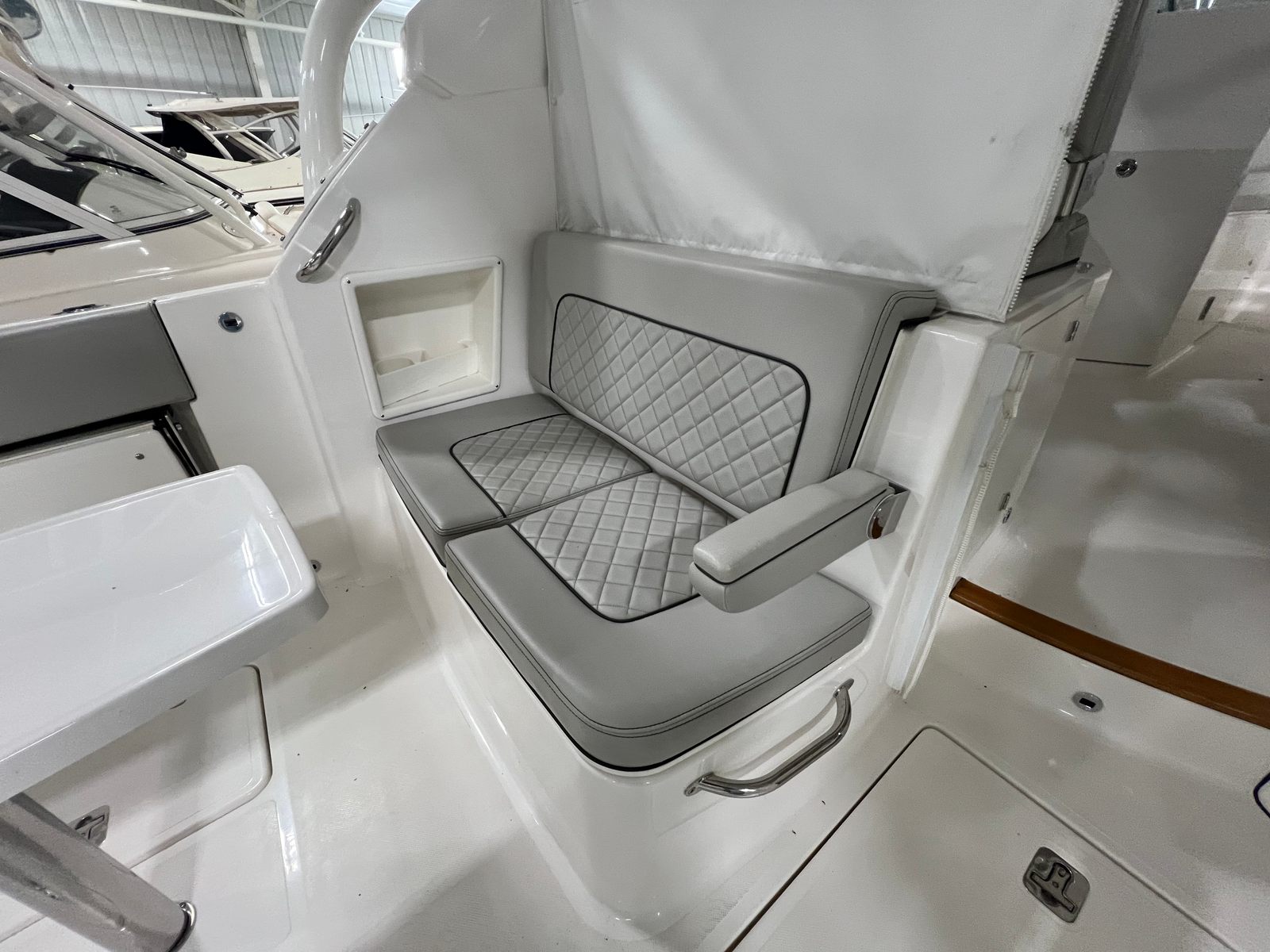The versatile layout offers an open bow for enjoying sunny days on the water, a powered Mediterranean shade that provides instant relief from the sun, and the ability to fully enclose the helm area when the weather shifts. The boat also features comfortable seating throughout, premium helm electronics, ample storage, a well-appointed cabin, and a head for extended days on the water.