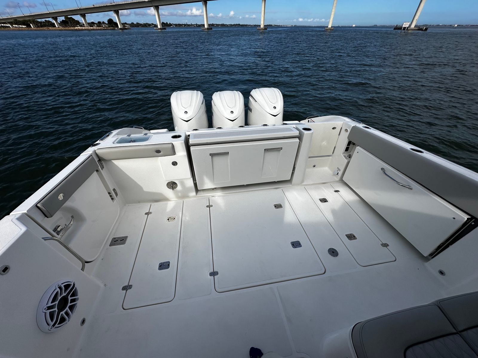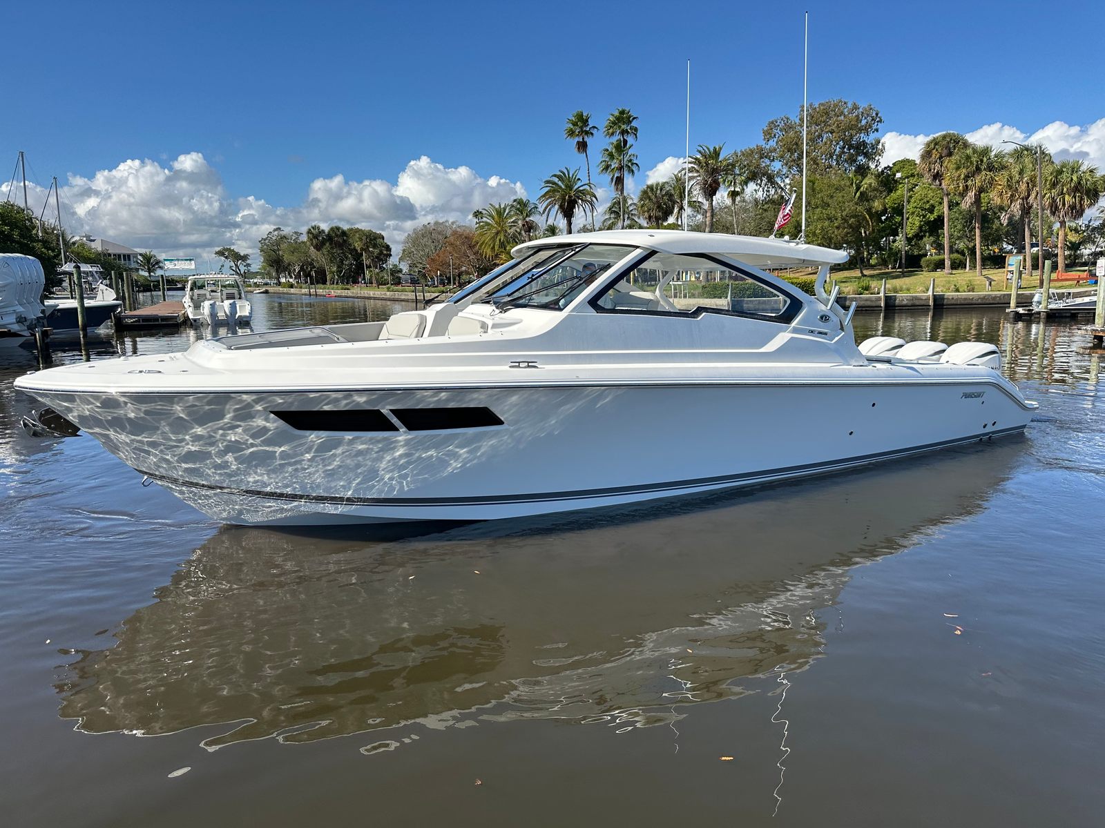 The Pursuit DC 365 is designed with practicality in mind, making ownership easy and enjoyable. The spacious layout provides plenty of room for storing gear, water toys, and essentials, so you’re always prepared for a day on the water. The dual console configuration makes docking and maneuvering straightforward, whether you’re at a busy marina or a secluded cove. The efficient triple Yamaha engines offer reliable performance and fuel economy, allowing you to spend more time exploring and less time refueling.The hardtop-mounted LED spotlight enhances safety and convenience during nighttime operations, while the cockpit air conditioning keeps everyone cool and comfortable. The upgraded audio system ensures that entertainment is always at your fingertips, and the underwater lights make evening outings truly special. Every detail of the DC 365 is designed to make your boating experience as enjoyable and hassle-free as possible.