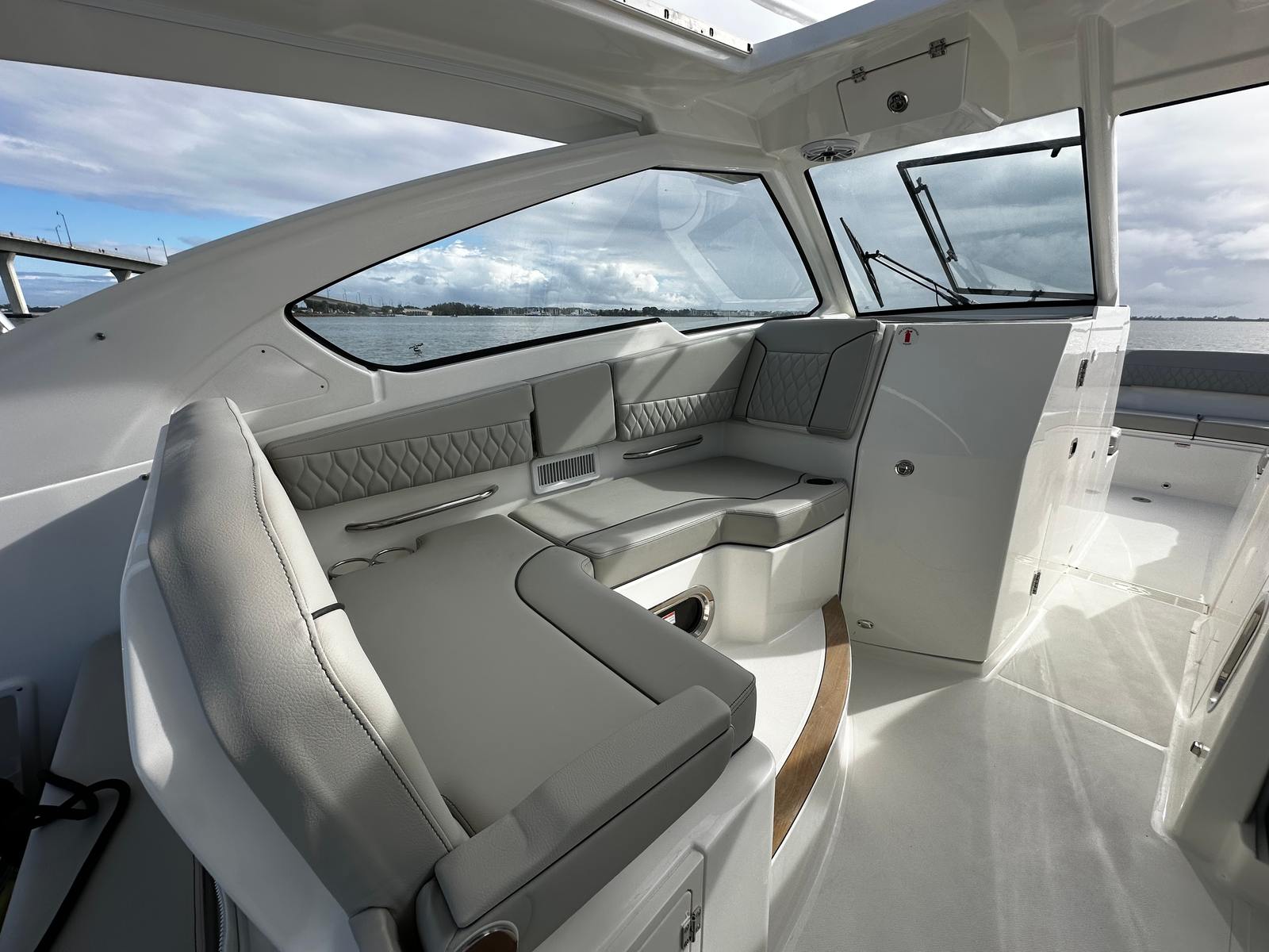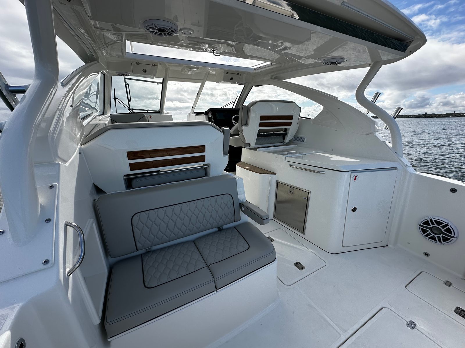 The Pursuit DC 365 is loaded with special features that enhance both functionality and enjoyment. The triple Yamaha Pearl White F350 engines not only provide impressive power but also add a touch of elegance to the boat’s overall aesthetic. The Seakeeper Gyro Stabilization System ensures a smooth and comfortable ride, making long days on the water more enjoyable for everyone on board. The hull’s fresh white color, complemented by the platinum boot stripe and accent, gives the boat a striking appearance that’s sure to impress.Inside, the Tranquil Sea interior package creates a relaxing and upscale environment, perfect for unwinding after a day of adventure. The cockpit is equipped with air conditioning, ensuring comfort even on the hottest days. The helm features a hardtop-mounted LED spotlight for enhanced visibility during nighttime excursions, while all color spectrum underwater lights add a dramatic and customizable ambiance to your evenings on the water. The upgraded amplifier and speakers with zone control and Sirius capability provide premium sound quality, allowing you to set the perfect mood for any occasion.