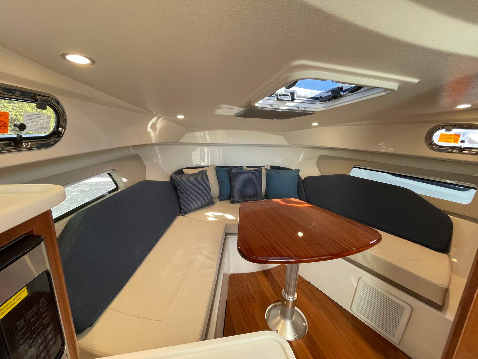 The Pursuit OS 325 is loaded with premium features that set it apart from other cruiser boats for sale. The SeaKeeper Ride 600 stabilizer enhances onboard comfort by minimizing roll, ensuring a smooth and steady experience even in choppy conditions. The helm and footrest, finished in a sophisticated carbon color, provide a modern touch and ergonomic support for long days at the wheel. Inside, the tranquil seas interior fabric and upgraded white upholstery create a serene and inviting atmosphere, perfect for relaxing after a day on the water.For those who value comfort and convenience, the OS 325 is equipped with a generator and a 16-gallon diesel tank, ensuring reliable power for extended trips. The cabin air conditioning with reverse cycle 110v/60Hz keeps the interior climate-controlled, offering respite from the summer heat or chilly evenings. Every detail, from the hull’s fresh white finish to the navy bootstripe, reflects Pursuit’s commitment to quality and style.
