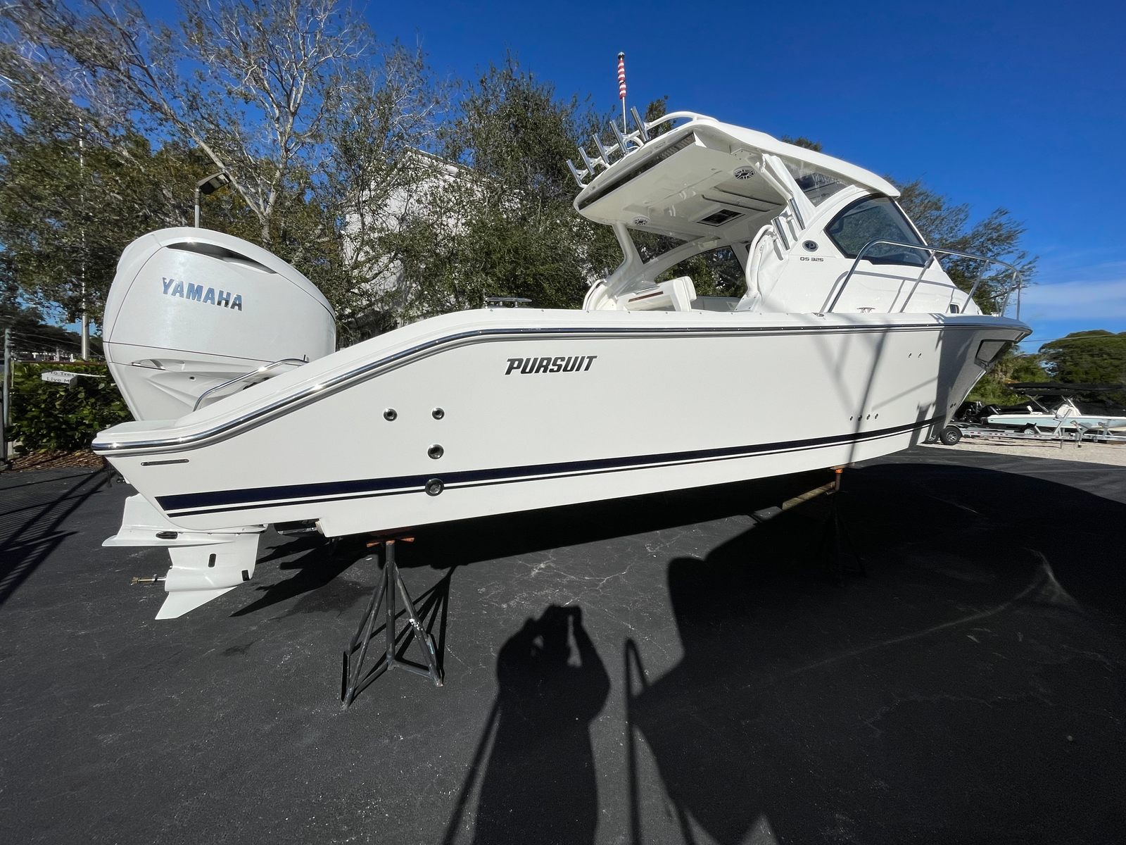 The 2026 Pursuit OS 325 is a 34.5-foot cruiser that exemplifies modern craftsmanship and innovation. Its sleek profile, highlighted by a fresh white hull and a striking navy bootstripe, ensures you will turn heads at every marina. As a new model, this Pursuit boat for sale offers the latest advancements in comfort, performance, and style, making it an exceptional choice for discerning boaters. The OS 325’s spacious layout is thoughtfully designed to maximize both relaxation and functionality, providing ample room for entertaining, lounging, and overnight stays.