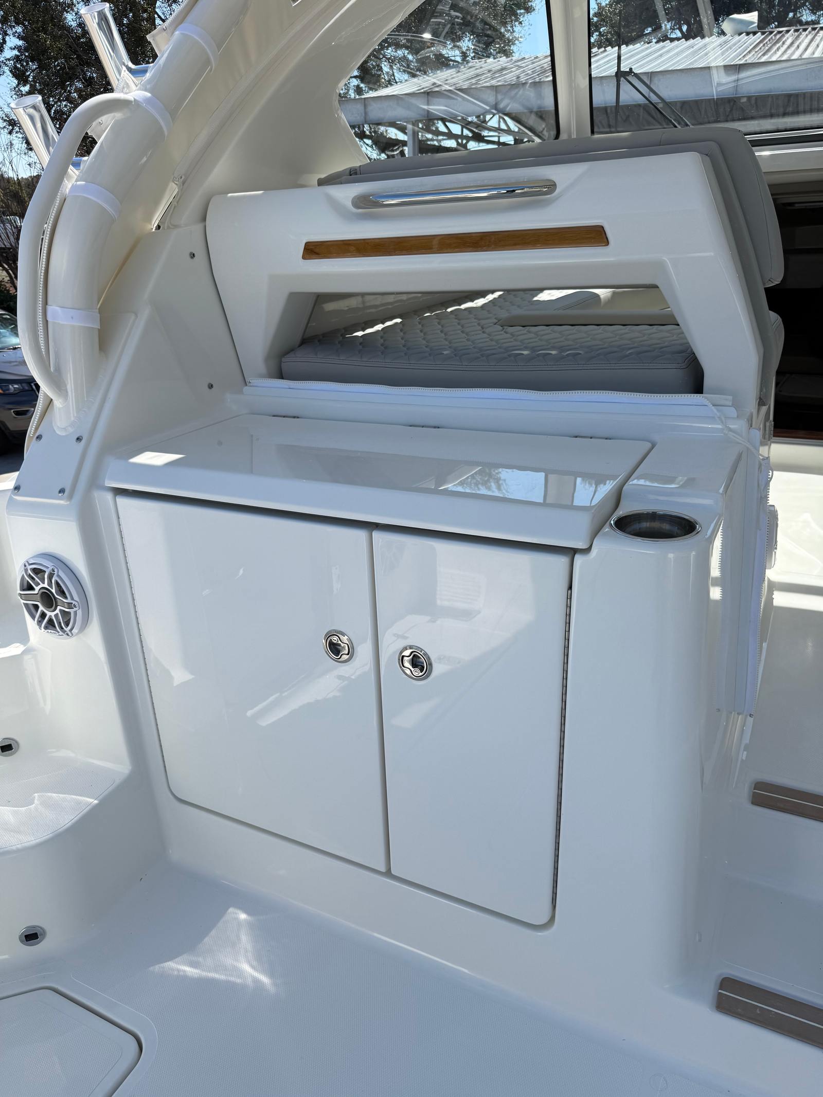 Step aboard the Pursuit OS 325 and discover a world of comfort and convenience. The interior fabric, finished in Tranquil Seas, creates a serene and inviting atmosphere, perfect for unwinding after a day on the water. The standard canvas upgrade features Stamoid material with polycarbonate windows in a crisp white finish, providing excellent protection from the elements while maintaining clear visibility and a stylish look.The bridgedeck teak table, complete with dedicated storage, offers a versatile space for dining, socializing, or simply enjoying the view. For those who love to soak up the sun, the forward deck sunpad with adjustable backrests and a Stamoid cover provides the ultimate relaxation spot. Advanced navigation is made possible with the Garmin Radar Dome GMR Fantom 24 (50 W), ensuring you stay safe and informed wherever your journey takes you.Comfort is paramount on the OS 325, with cabin air conditioning featuring reverse cycle 110v/60Hz (10,000 BTU) to keep the interior cool and comfortable in any weather. Every detail, from the hullside color to the bootstripe, has been carefully selected to enhance both aesthetics and functionality, making this Pursuit boat for sale a true standout in its class.