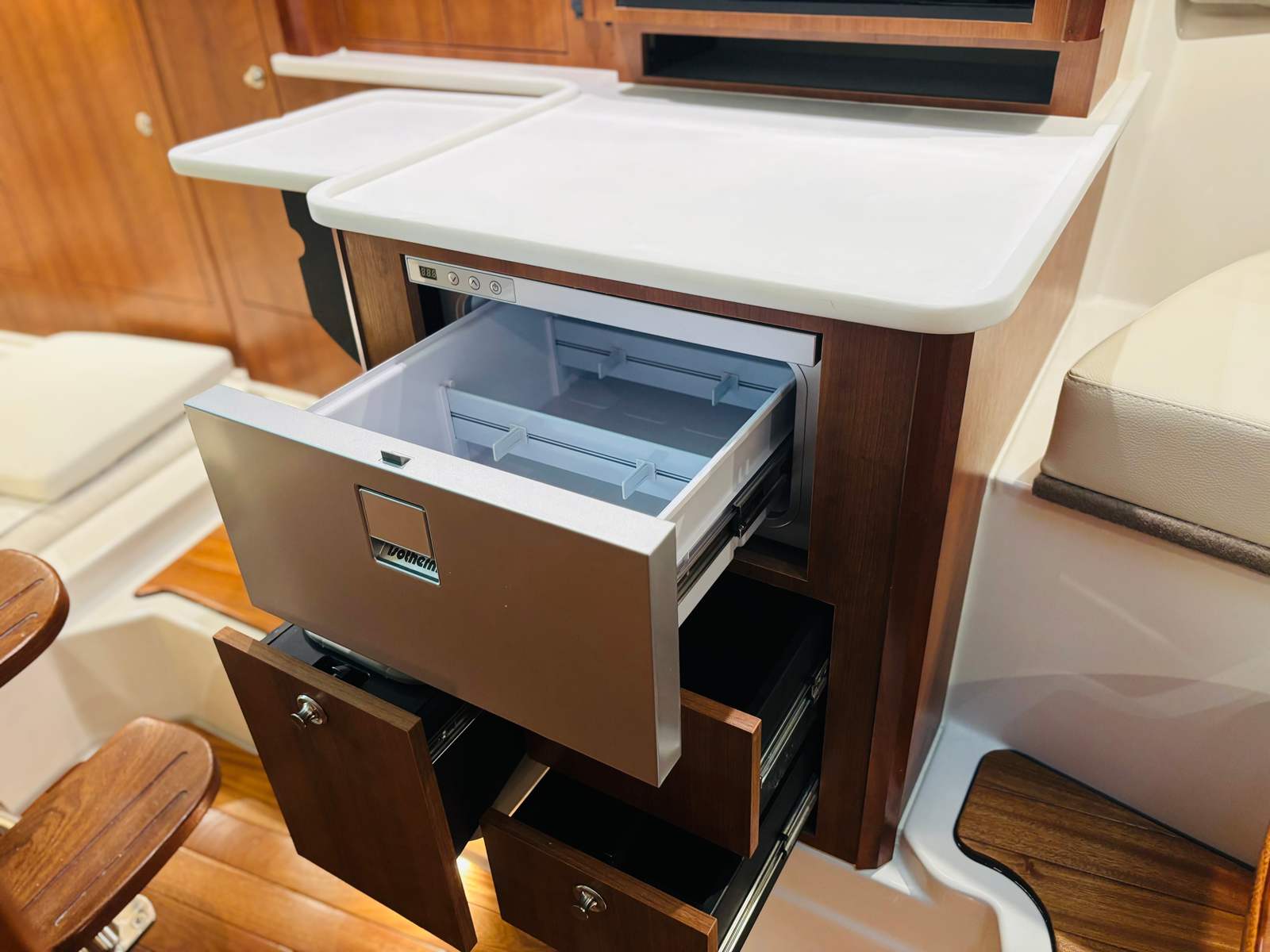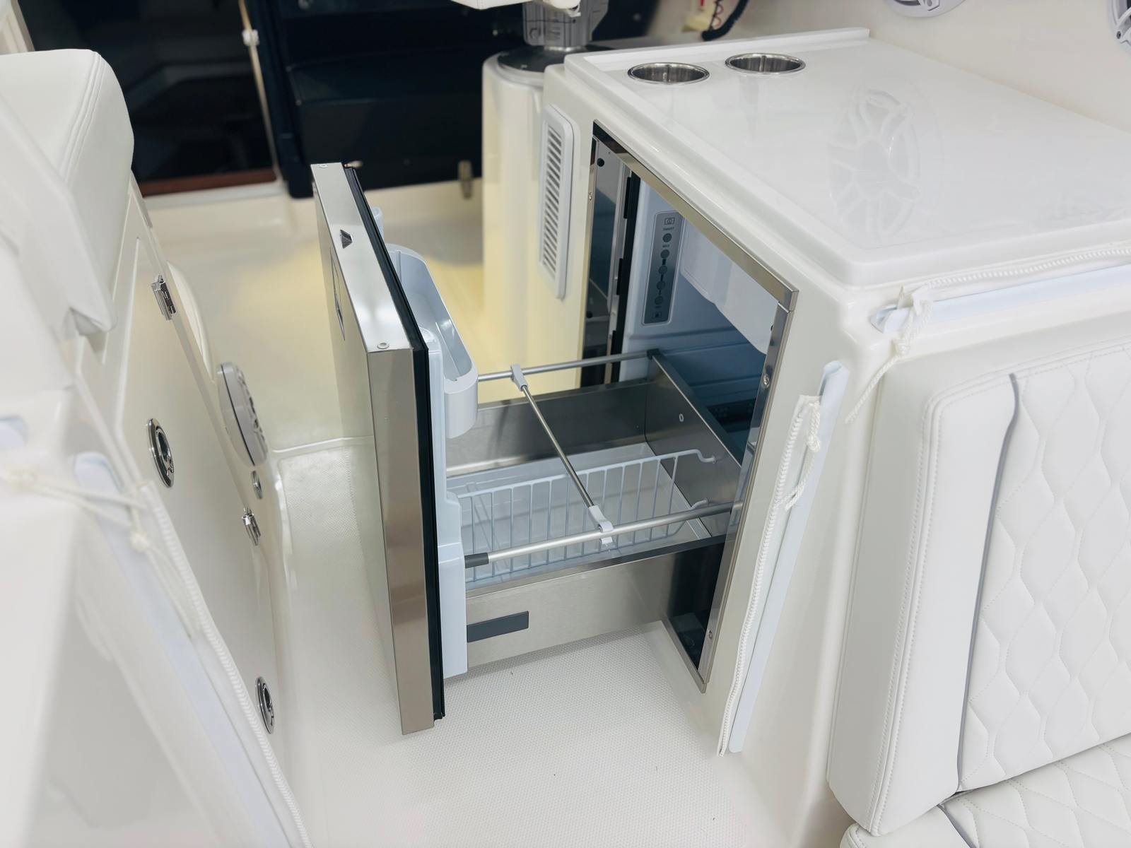Beyond its luxurious amenities, the Pursuit OS 325 is engineered for practical, everyday enjoyment. The advanced Yamaha Joystick Control with full maneuverability and autopilot functions makes docking and tight maneuvers effortless, reducing stress and increasing safety. The Multifunction Display Interface provides real-time information at your fingertips, helping you navigate with confidence and ease.Storage is thoughtfully integrated throughout the boat, allowing you to bring along all the gear and supplies you need for a day on the water or an extended adventure. The efficient generator and air conditioning systems ensure that you can enjoy all the comforts of home, even when you are miles from shore. The Pursuit OS 325’s design also prioritizes fuel efficiency, helping you make the most of every trip without compromising on performance.