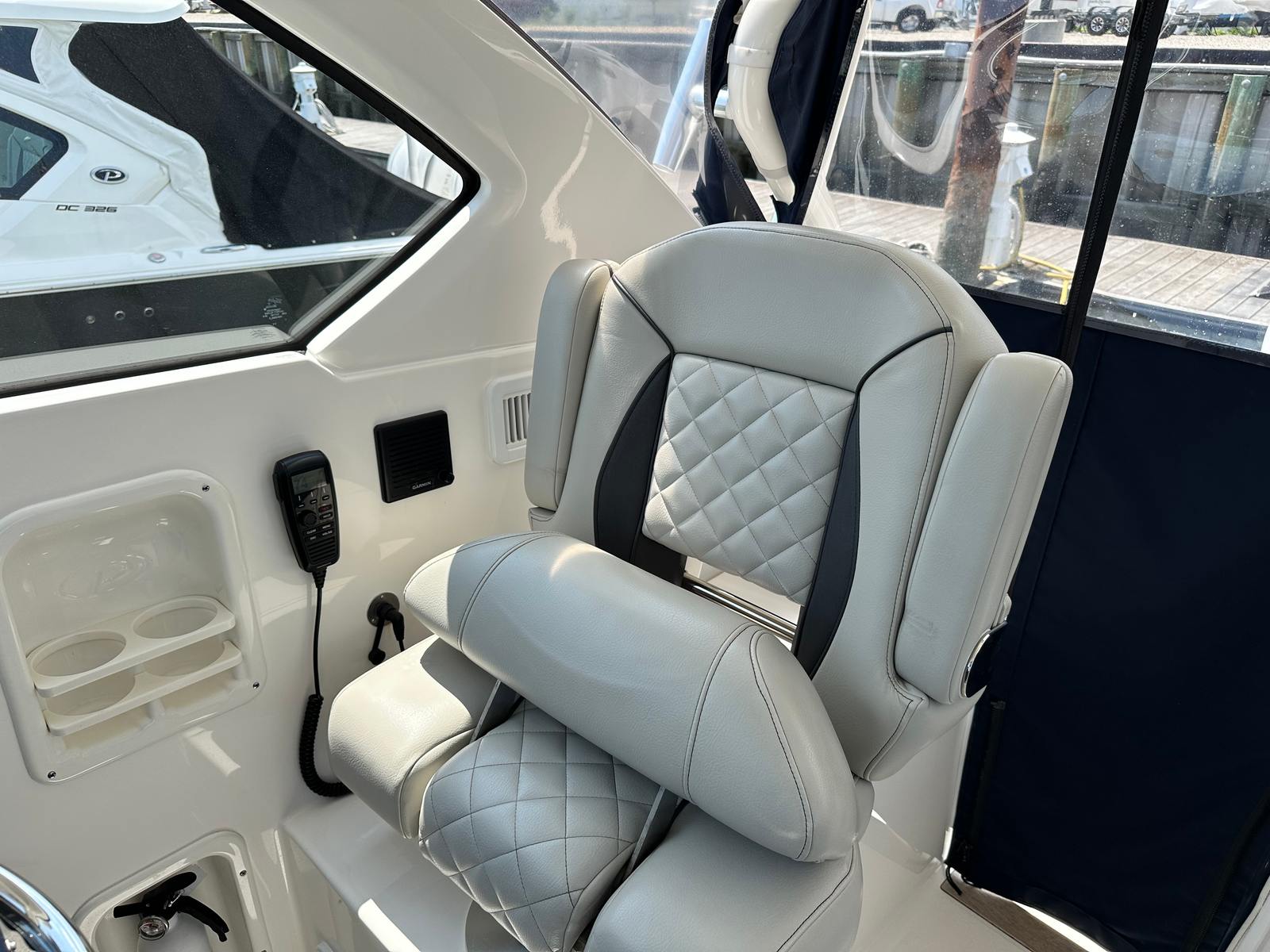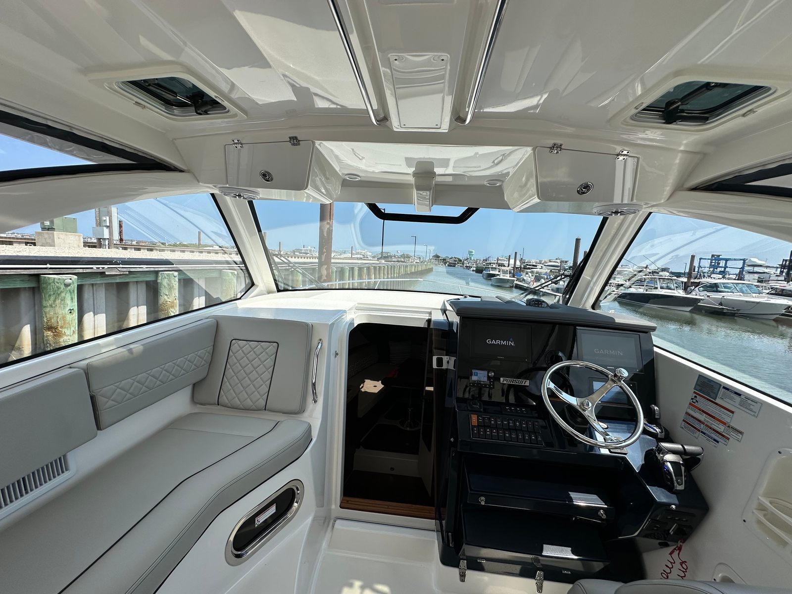 The Pursuit 355 OS is designed with both luxury and functionality in mind. Its spacious layout provides plenty of room for guests, making it ideal for social gatherings and extended trips. The cruiser’s thoughtful design maximizes comfort, with well-appointed seating areas and ample deck space for sunbathing, dining, or simply enjoying the view. The helm station is ergonomically designed for ease of use, offering excellent visibility and intuitive controls for a stress-free boating experience. Every detail of this Pursuit boat for sale reflects the brand’s commitment to quality craftsmanship and innovative design.