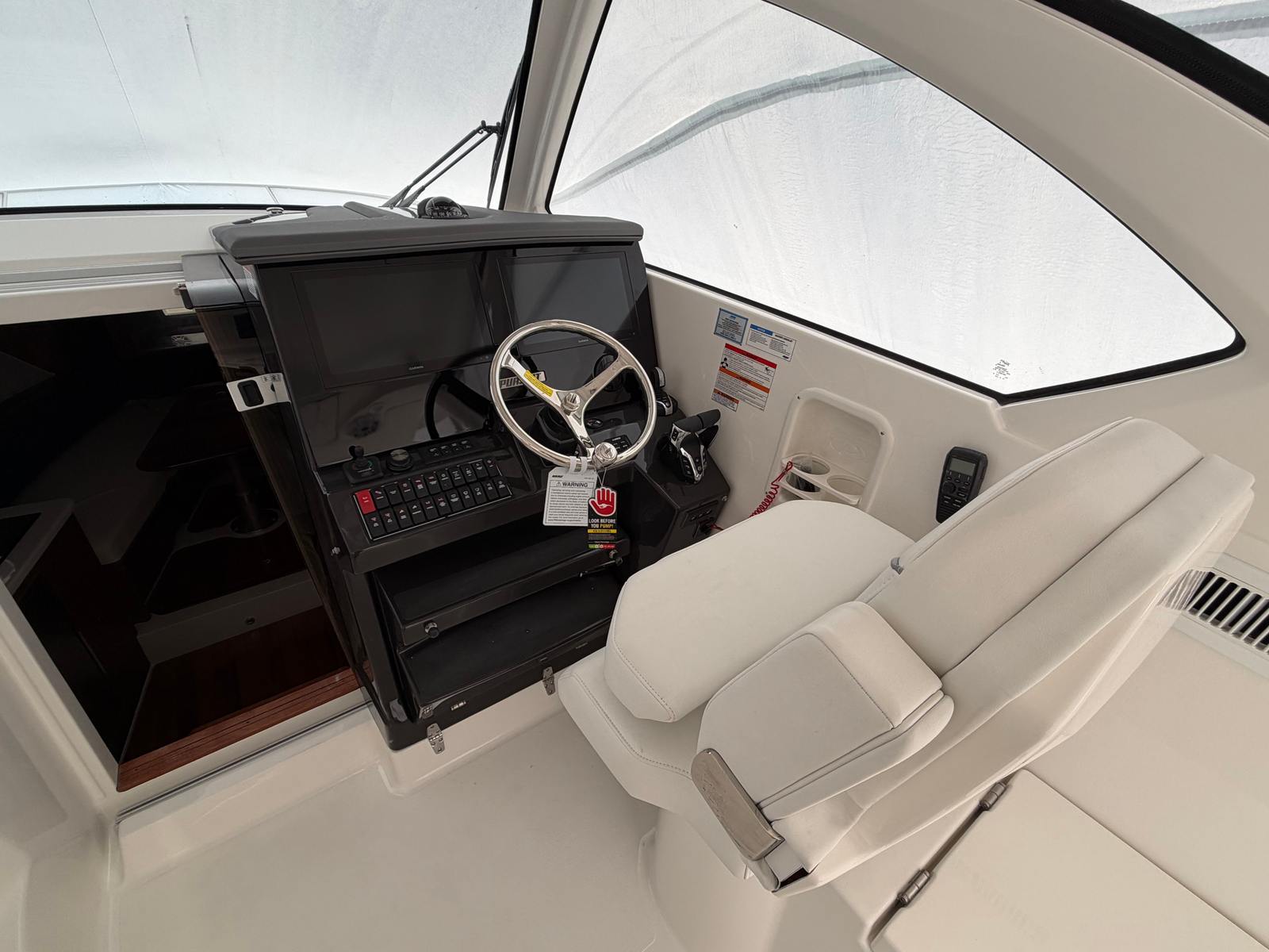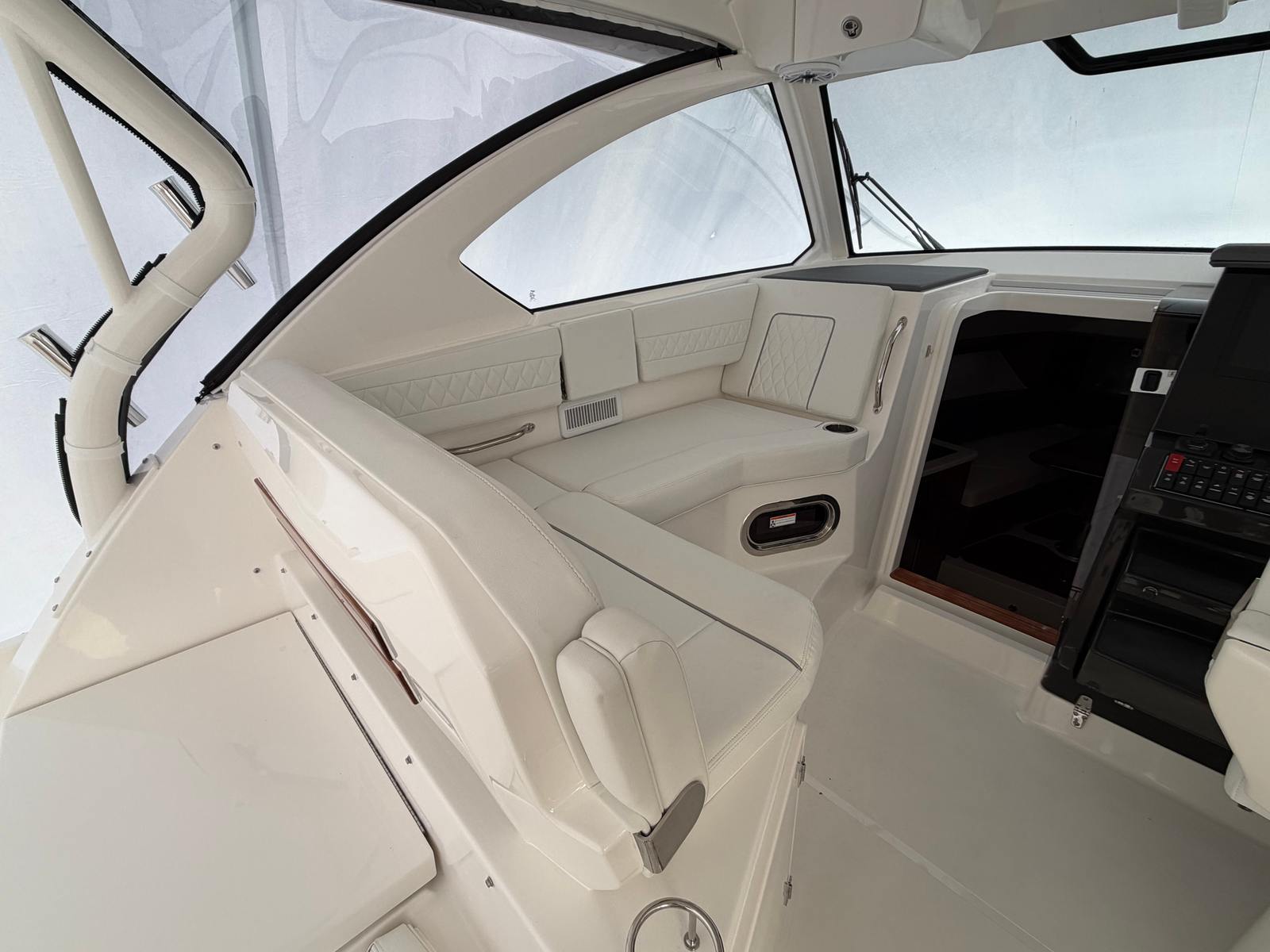 Practicality meets luxury in the Pursuit OS 355. The fold-down seat on the starboard gunwale offers convenient storage and seating solutions, maximizing space without sacrificing comfort. The forward deck sun lounge cushions are perfect for sunbathing or relaxing, and the included cover protects them from the elements when not in use. Docking is made easier thanks to the boat’s thoughtful design and maneuverability, while the efficient Yamaha engines help keep fuel costs manageable.The cockpit air conditioning system ensures that hot summer days never get in the way of your enjoyment, and the durable vinyl upholstery is easy to clean and maintain. Whether you’re planning a day trip, an overnight excursion, or a weekend getaway, the Pursuit OS 355 is equipped to handle all your needs with style and efficiency.