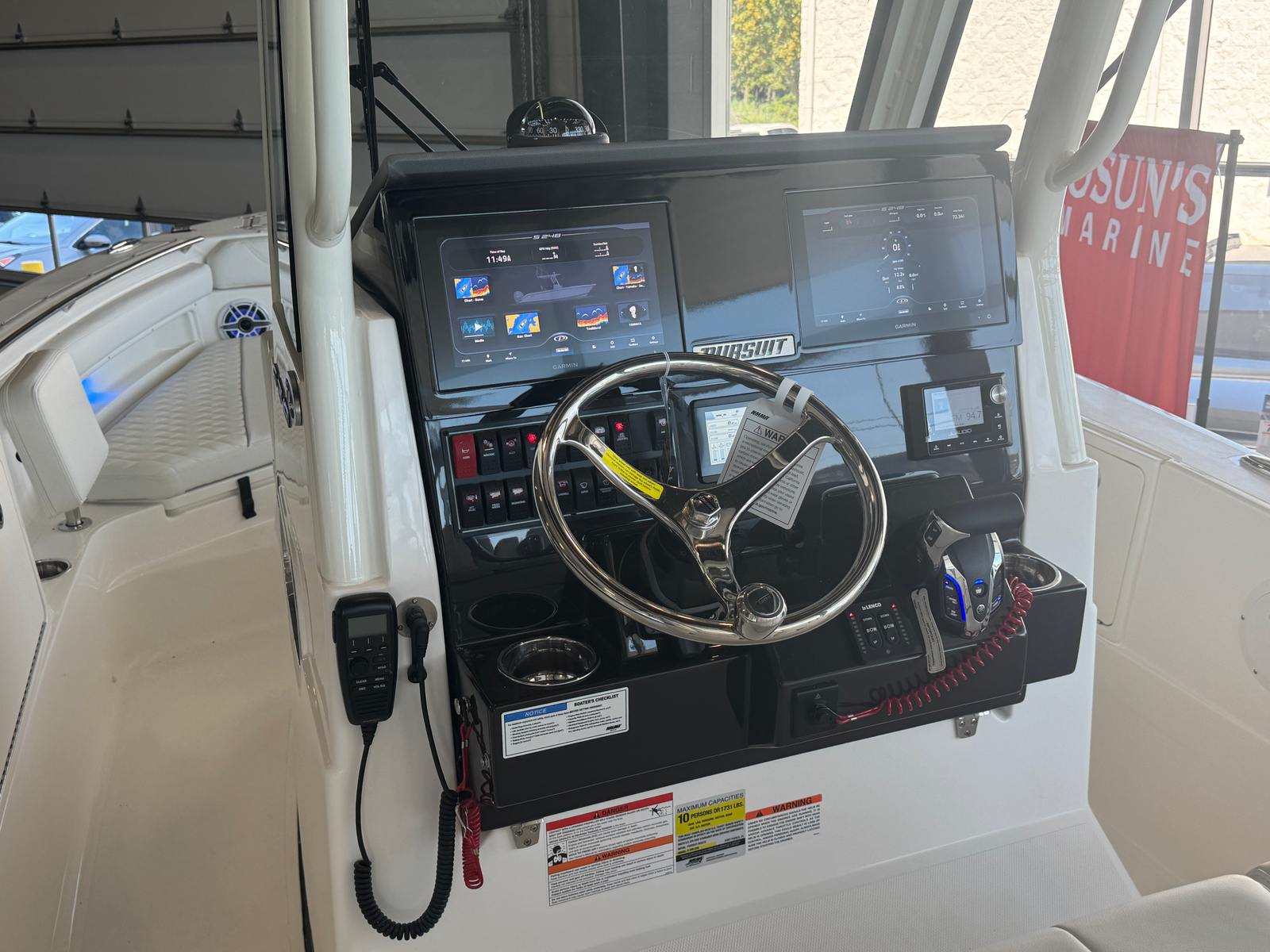 - Garmin Electronics Package (GPSMAP 8612XSV, B75M 20 Degree 600 watt CHIRP Transducer, NMEA 2000 Starter kit, Pursuit Custom Dash Panel, VHF radio)