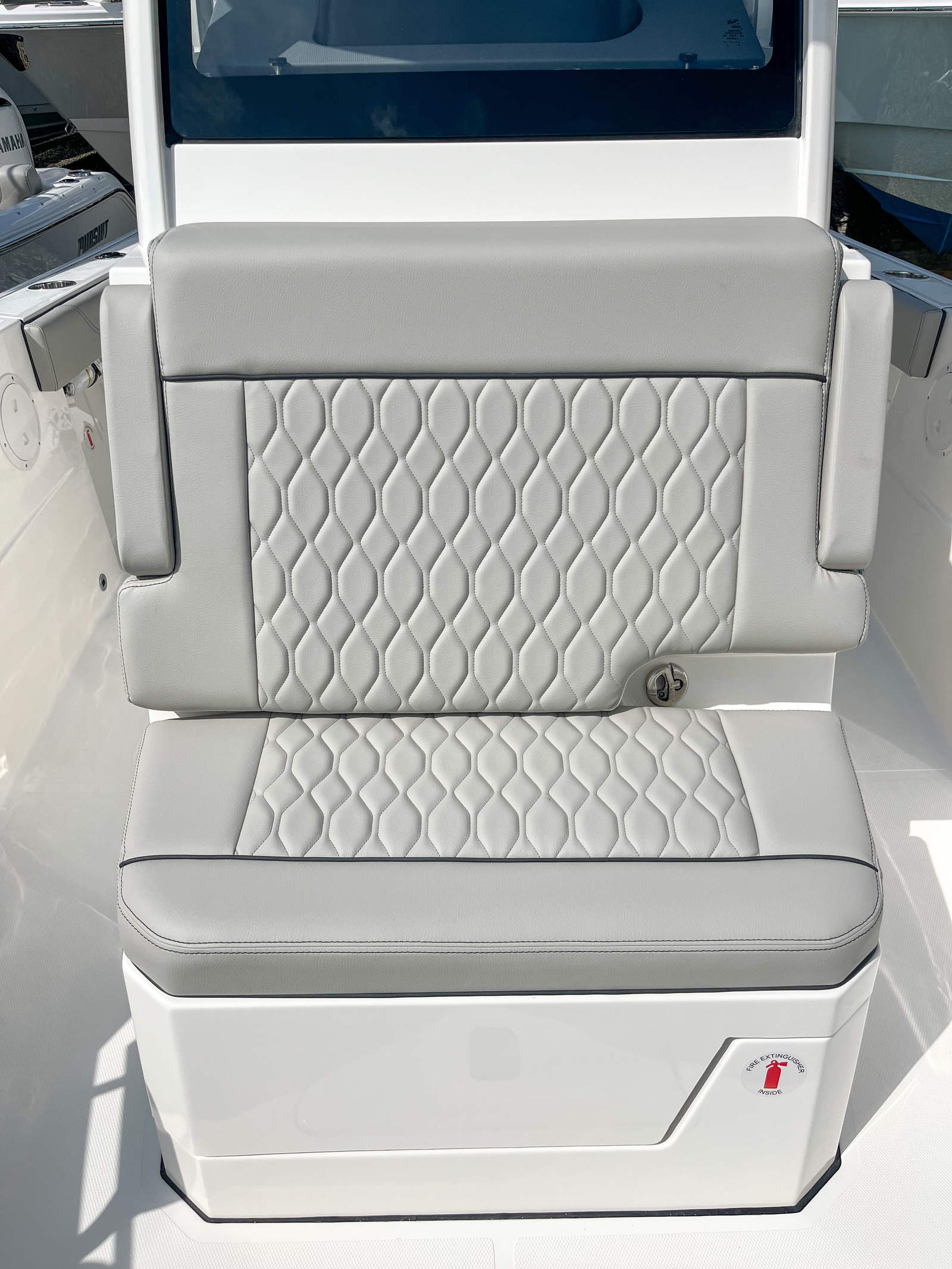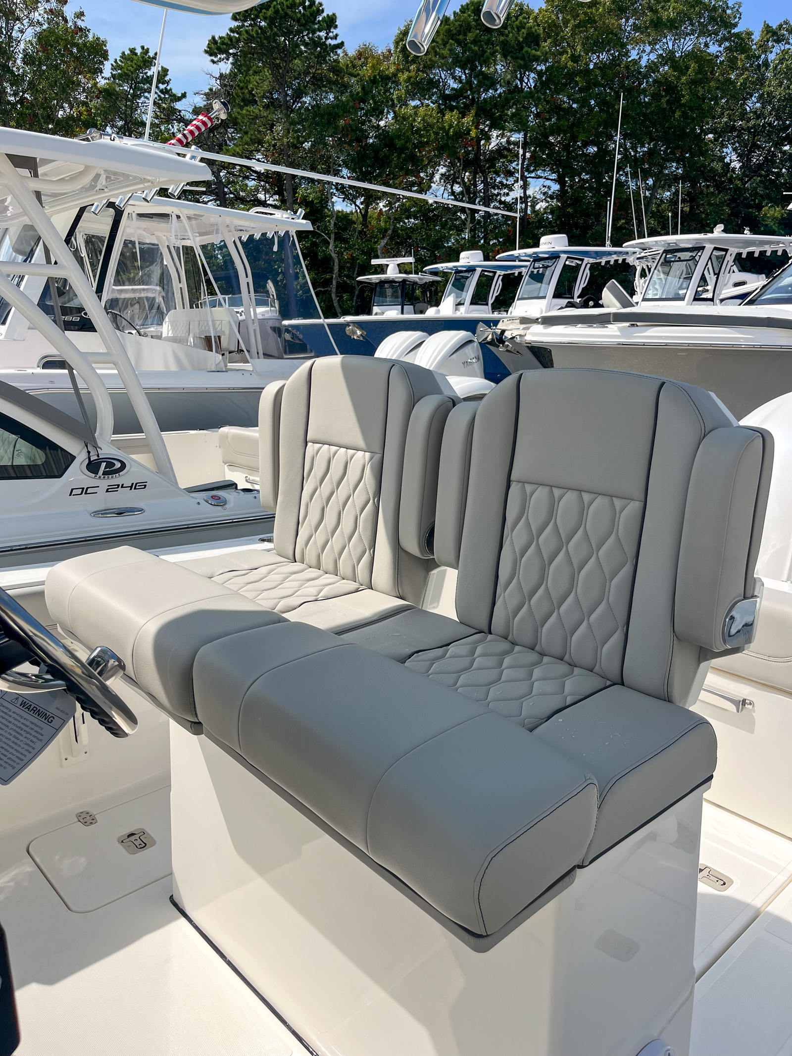 - Premium Helm Seating w/Four (4) Folding Armrests, Articulating Flip-up Bolsters, Upgraded Seat Slide with Fore/Aft Adjustments, and Edson® 316L SS Steering Wheel with Control Knob and Non-Slip Grip
