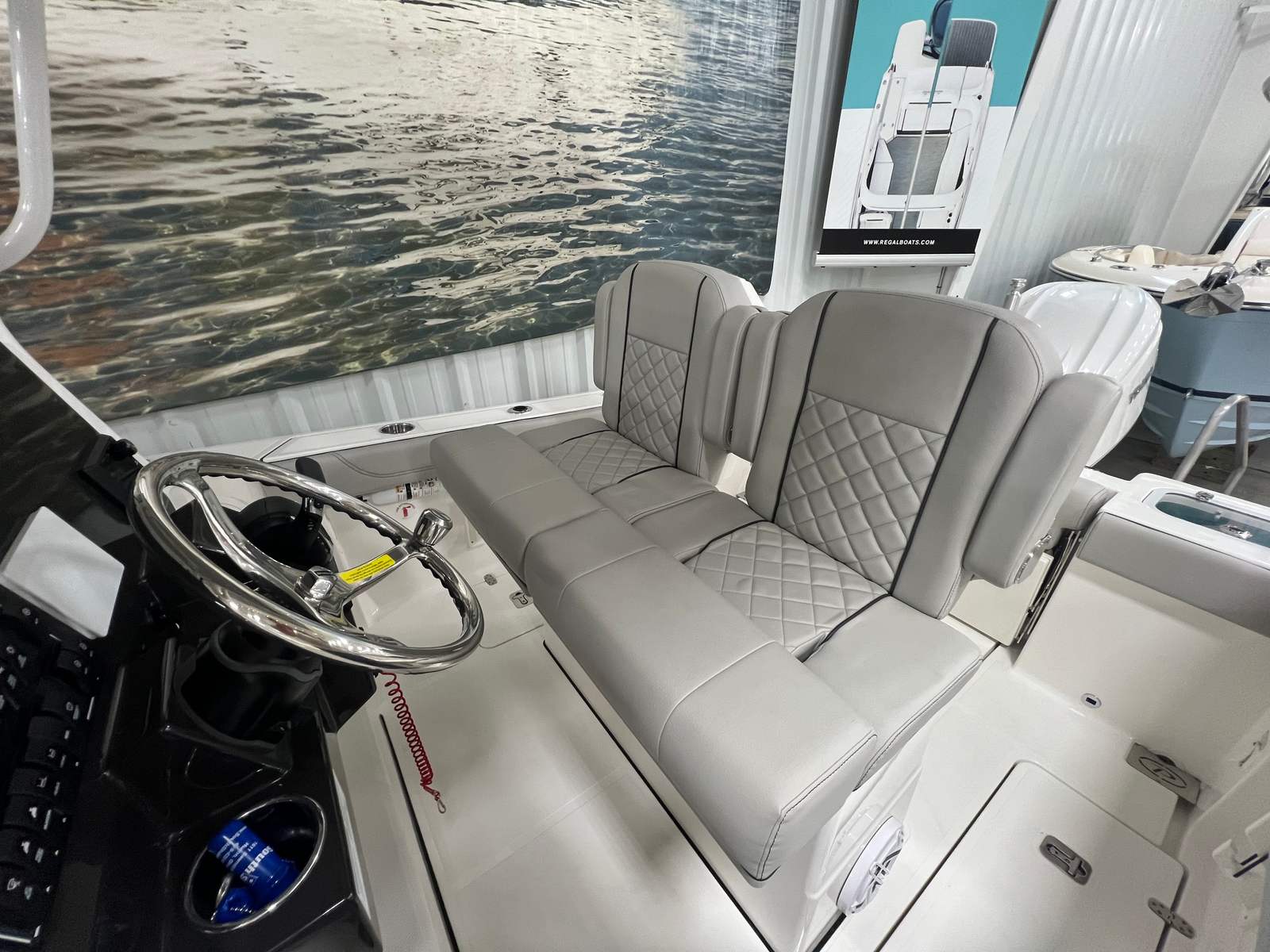 - Premium Helm Seating w/Four (4) Folding Armrests, Articulating Flip-up Bolsters, Upgraded Seat Slide with Fore/Aft Adjustments, and Edson® 316L SS Steering Wheel with Control Knob and Non-Slip Grip
