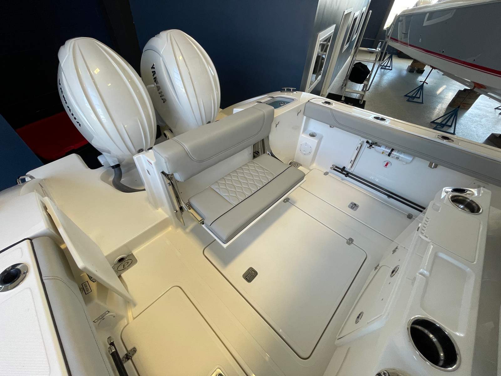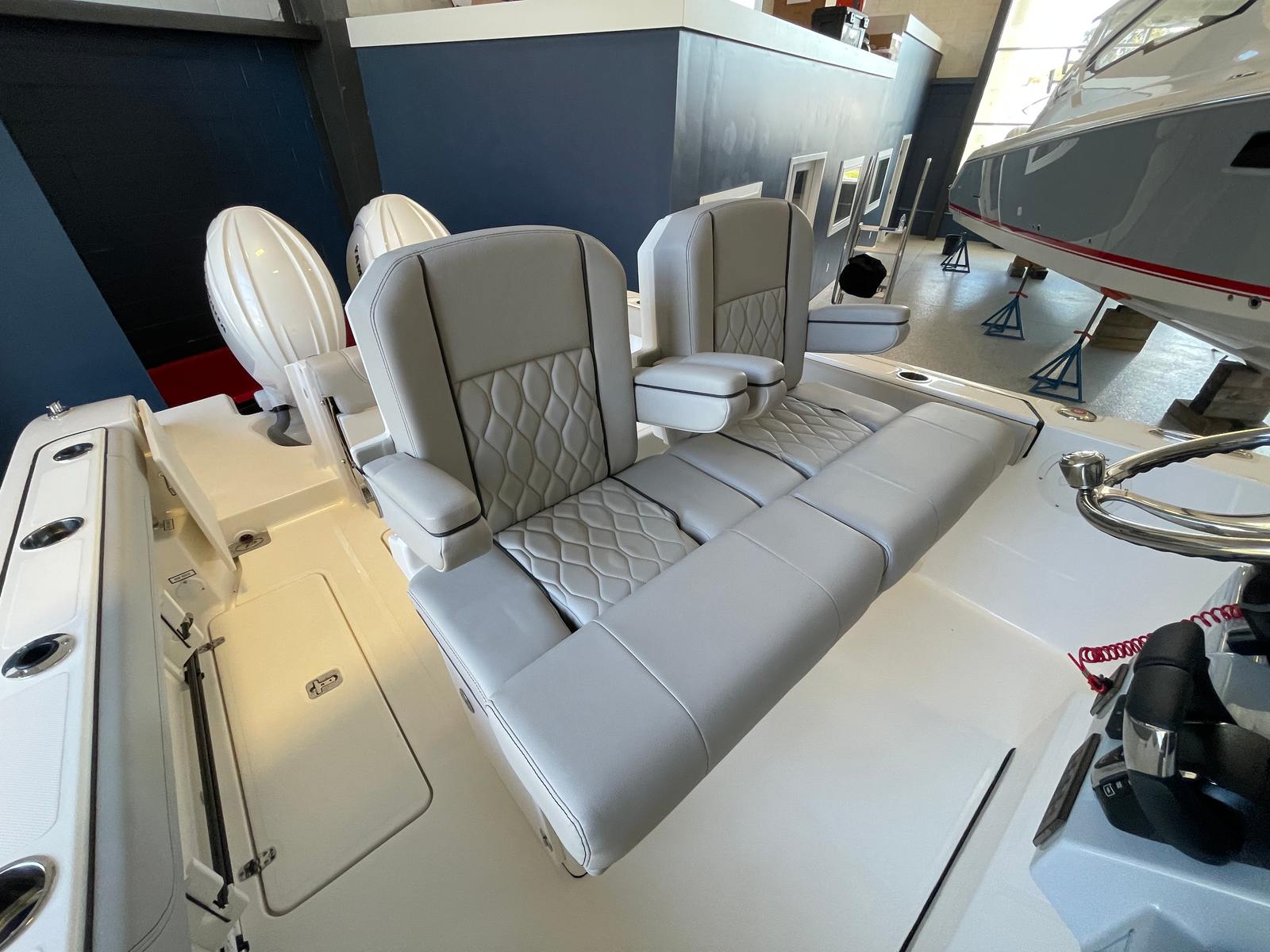 - Premium Helm Seating w/Four (4) Folding Armrests, Articulating Flip-up Bolsters, Upgraded Seat Slide with Fore/Aft Adjustments, and Edson® 316L SS Steering Wheel with Control Knob and Non-Slip Grip