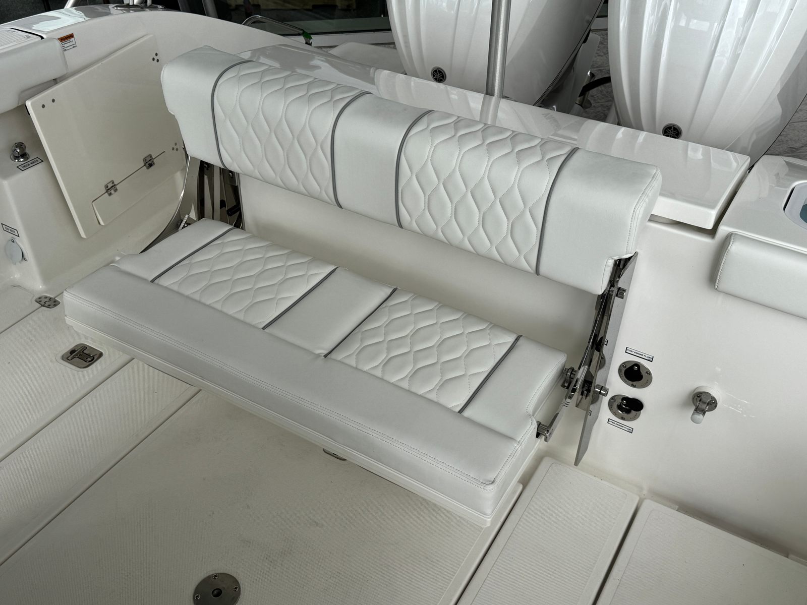 - Twin Yamaha Digital F300 V6 Offshore (Pearlescent White) w/Integrated Digital Electric Steering (DES) and Helm Master EX Digital Electronic Control (DEC) (does not include joystick control), Multifunction Display Interface and Manual Engine Flushing System