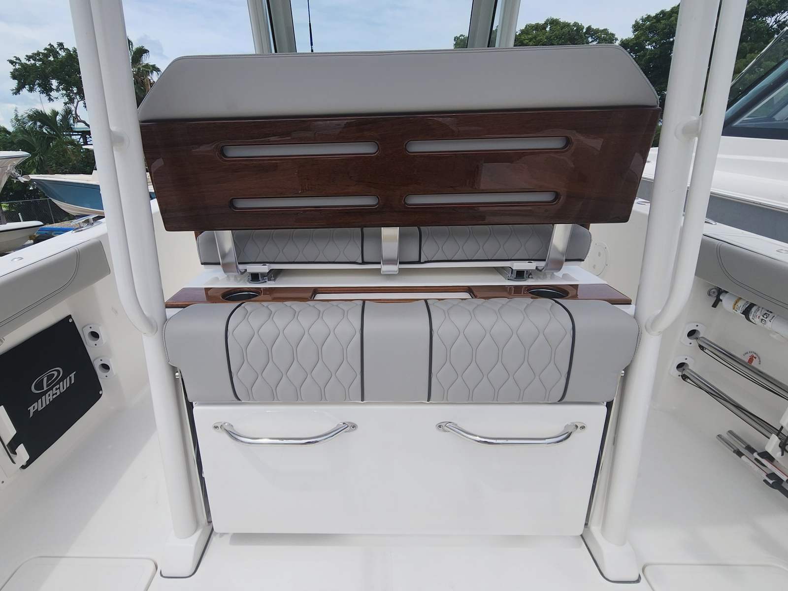 The Pursuit S 288 is loaded with features that elevate your boating experience. The helm and footrest are finished in a stylish Carbon color, creating a modern and comfortable command center for the captain. The hardtop liner matches the Fresh White hull, enhancing the boat’s cohesive and elegant aesthetic. A hullside boarding door ladder offers convenient access for swimmers, divers, or anyone boarding from the dock, while the 110V/60HZ dockside power with battery charger ensures your onboard systems stay powered up and ready for action.For those who love to enjoy the water after sunset, the S 288 is equipped with three all color spectrum underwater lights. These lights not only add a dramatic visual effect but also enhance safety and visibility during evening outings. The absence of a bow thruster is offset by the intuitive joystick system, which provides precise control for docking and close-quarters maneuvering.