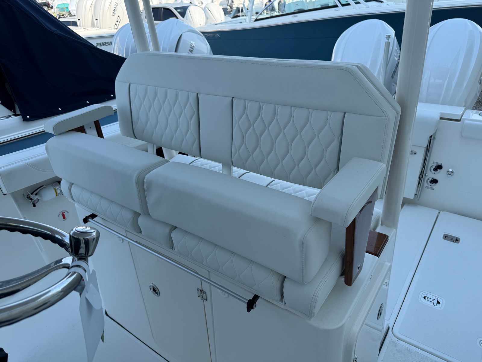 Step aboard the Pursuit S 288 and discover a world of innovative features designed to enhance your boating experience. The helm is outfitted with a GARMIN WIDESCREEN 12" DISPLAY PKG, complemented by a second GARMIN WIDESCREEN 12" DISPLAY, providing state-of-the-art navigation and system monitoring at your fingertips. The helm itself boasts a striking Flag Blue finish, while protective Blue Helm Seat and Instrument Covers keep your controls looking pristine.Comfort and style are evident throughout the boat, with a Blue Bow Tonnean Cover offering shade and protection for the forward seating area. The hardtop liner in fresh white adds a touch of elegance and ensures a cool, comfortable environment even on the sunniest days. Entertain guests with the versatile Bow/Cockpit Table, crafted from durable fiberglass and featuring dedicated storage for convenience. For those seeking relaxation, the Bow Mediterranean Style Sunshade is easily stowable, providing a luxurious retreat from the midday sun.