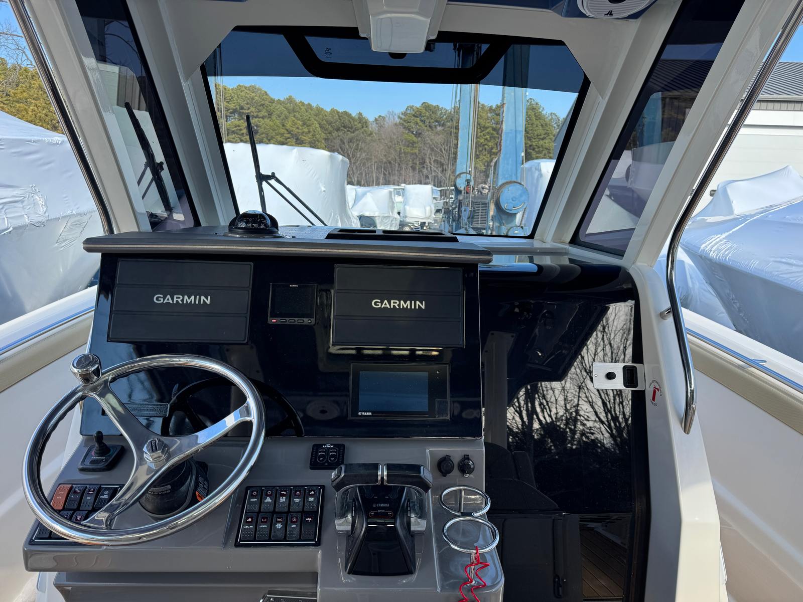 The Pursuit S 328 is loaded with premium features designed to enhance your boating experience. The Garmin Package includes dual GPSMAP 8612 units (one XSV), an Airmar B175M 1KW CHIRP transducer, and a NMEA 2000 starter kit, providing state-of-the-art navigation and fish-finding capabilities. The Pursuit custom dash panel and Yamaha Gateway with cable ensure seamless integration and easy access to critical information, while the VHF antenna and pre-rig for VHF radio add to your safety and communication options.A blue helm seat cover adds a touch of style and protection, while the 110v/60Hz cockpit grill invites you to enjoy freshly prepared meals on board. The S 328’s three all-color Sea Blaze Quattro Spectrum underwater lights create a captivating ambiance for evening cruises or dockside gatherings. The helm features a sophisticated carbon finish, complemented by a navy boot stripe and a white/gray upholstery color scheme that exudes modern elegance.For comfort and convenience, the custom retractable sunshade with one-touch operation provides instant relief from the sun, making long days on the water more enjoyable. The underside of the hardtop is finished in crisp white, enhancing the boat’s clean and contemporary look.
