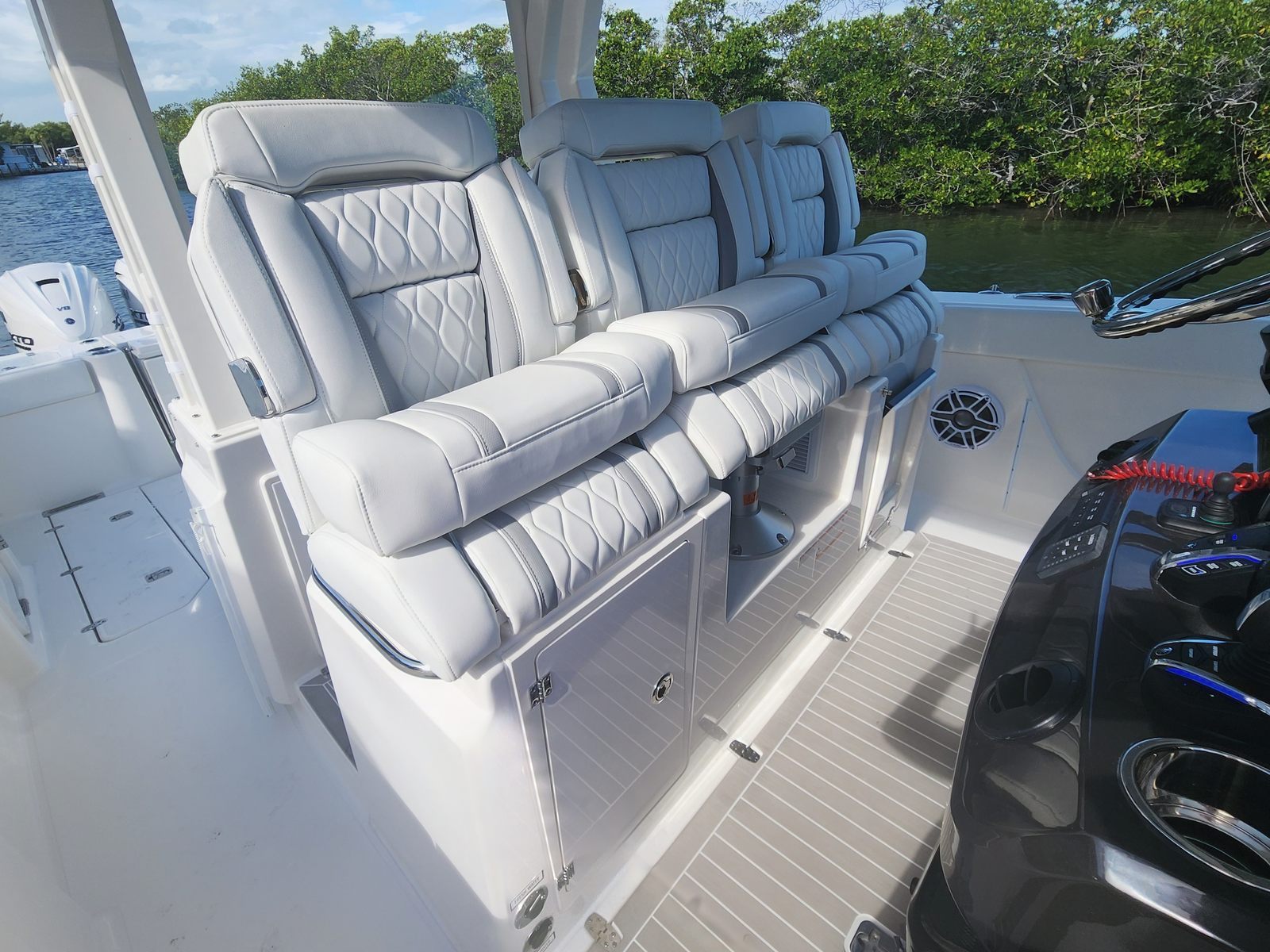 Powering the Pursuit S 388 are three robust engines, delivering a combined 1350 horsepower. This impressive setup ensures that the S 388 is more than capable of handling a variety of water conditions, from calm bays to challenging offshore environments. The triple-engine configuration provides exhilarating acceleration, smooth cruising, and reliable performance, making this Center Console boat for sale an ideal choice for those who value speed and agility. Whether you’re chasing the horizon or navigating tight channels, the S 388 offers responsive handling and stability, giving you confidence every time you take the helm.
