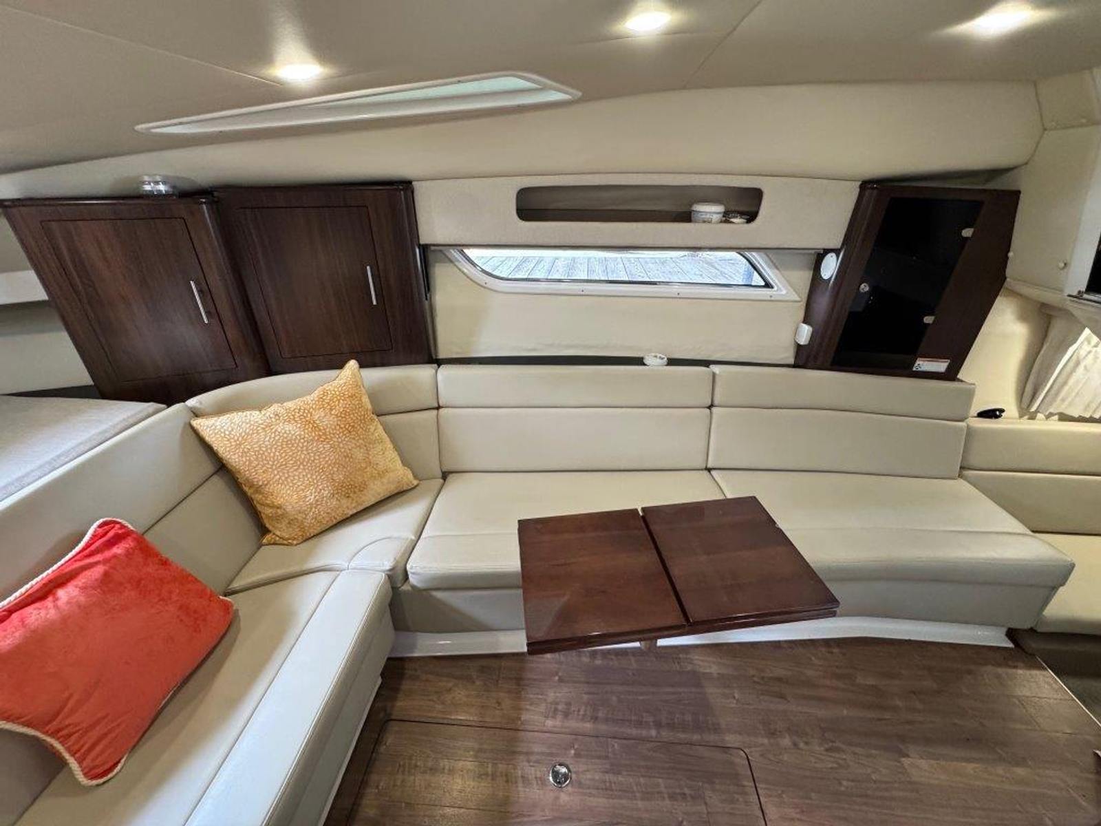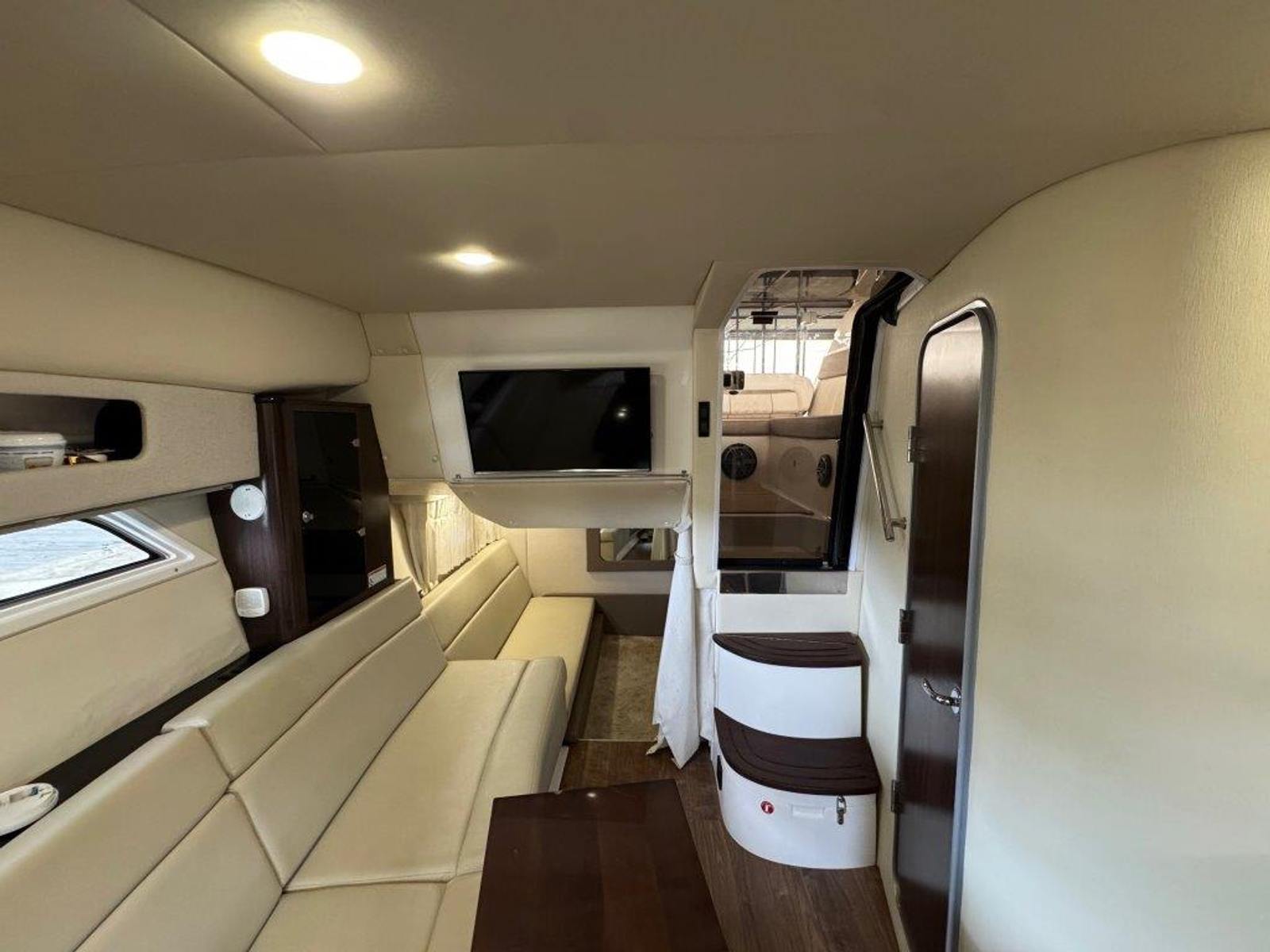 The hard enclosure and retractable hardtop have made the 35 Sport Coupe the #1 selling sport cruiser in its class. This design allows year-round boating in comfort, regardless of temperature. The cockpit is arranged for entertaining without leaving the party. On the starboard side, you’ll find a full wet bar with freshwater sink, smokeless grill, refrigerator, and ice maker, all within easy reach.
