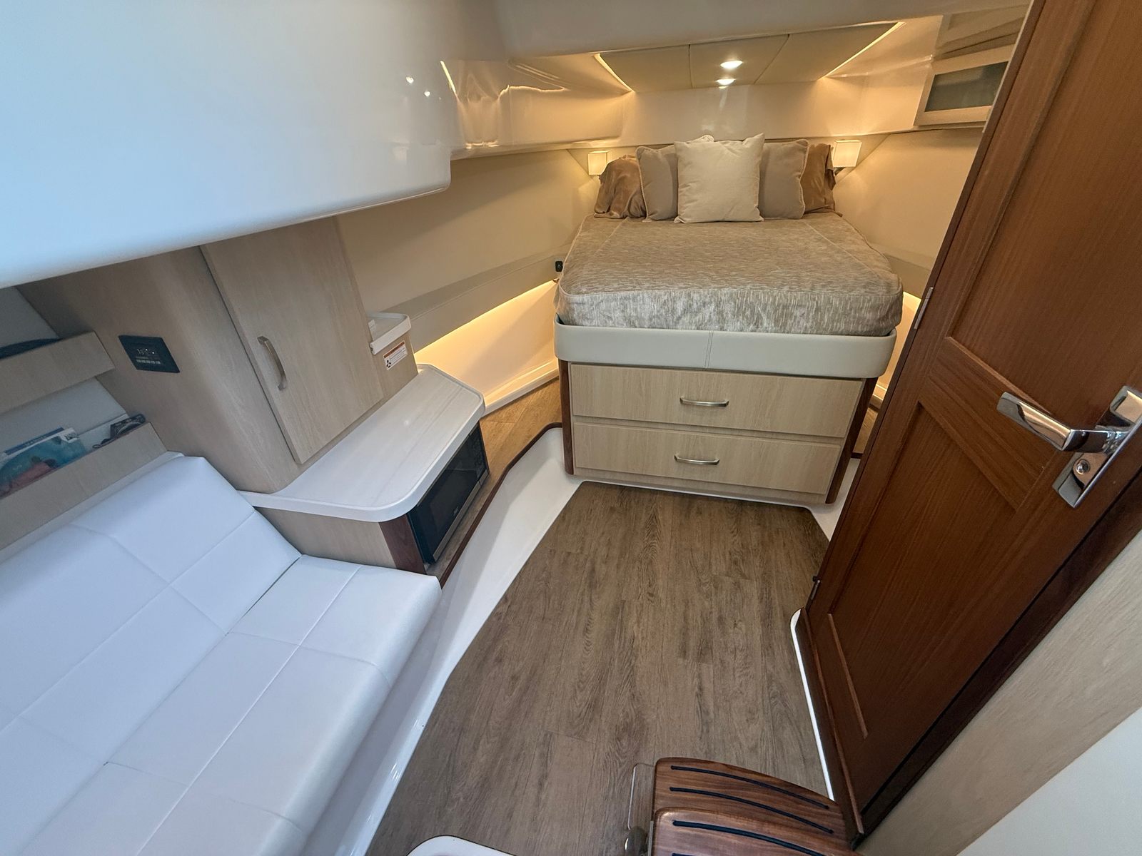 • Large head compartment with separate walk in shower includes handcrafted cabinetry and premium countertops.