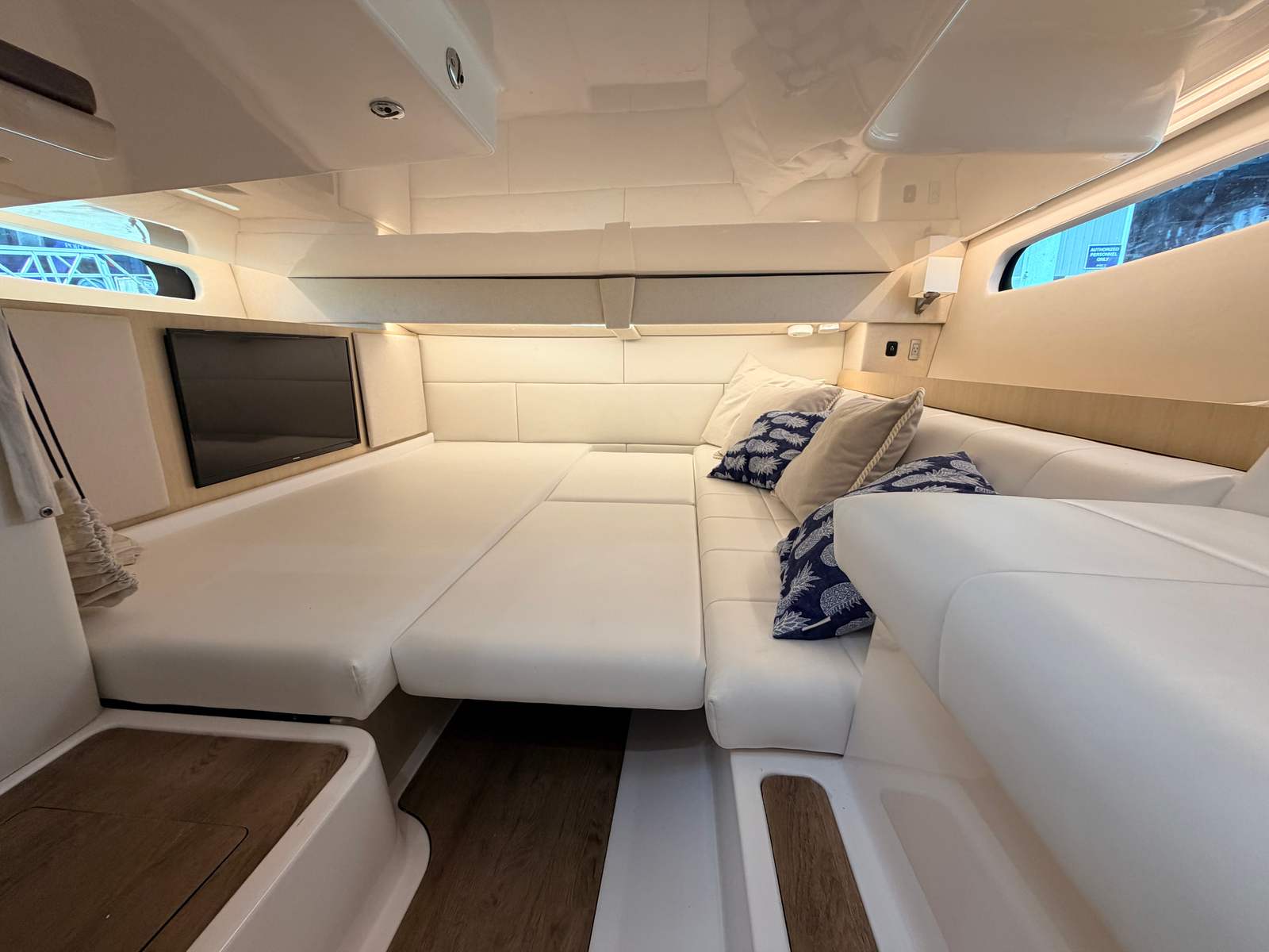 Spacious Bow Lounge with wraparound seating and fold‑out armrests
