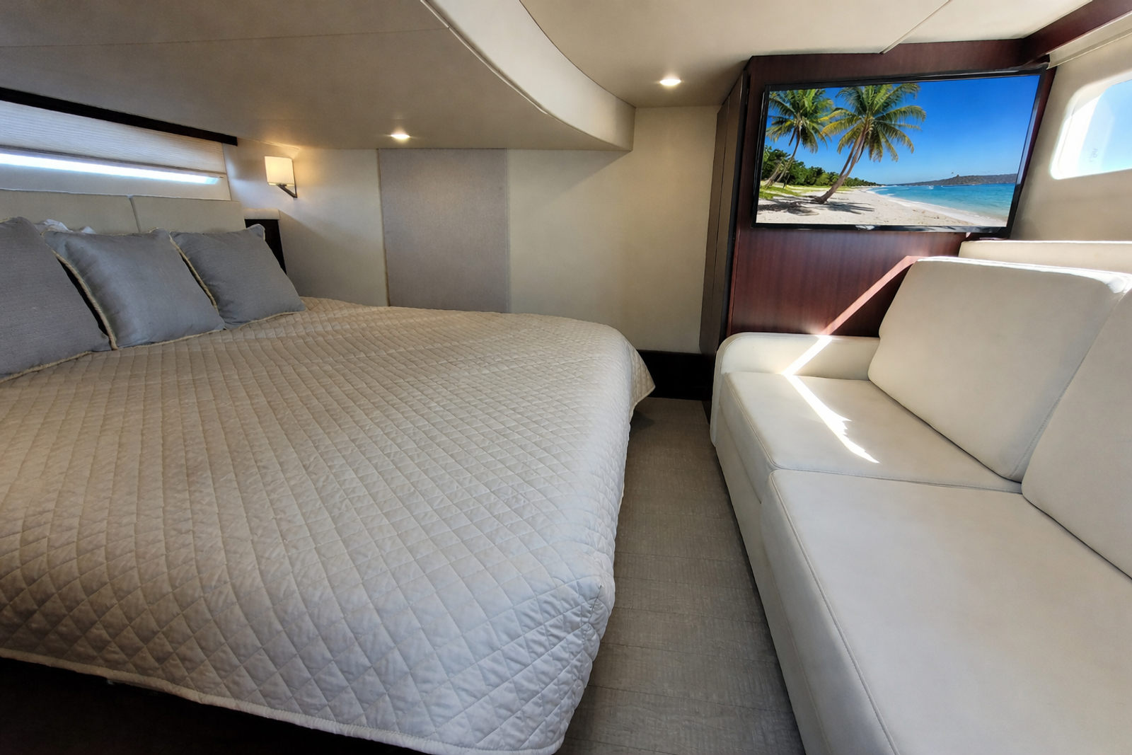 Accommodations: Below deck, the yacht features a two-stateroom layout. The forward master stateroom has an island queen bed with walk-around space, while the aft stateroom offers a large king-size bed that can be converted into twin berths.